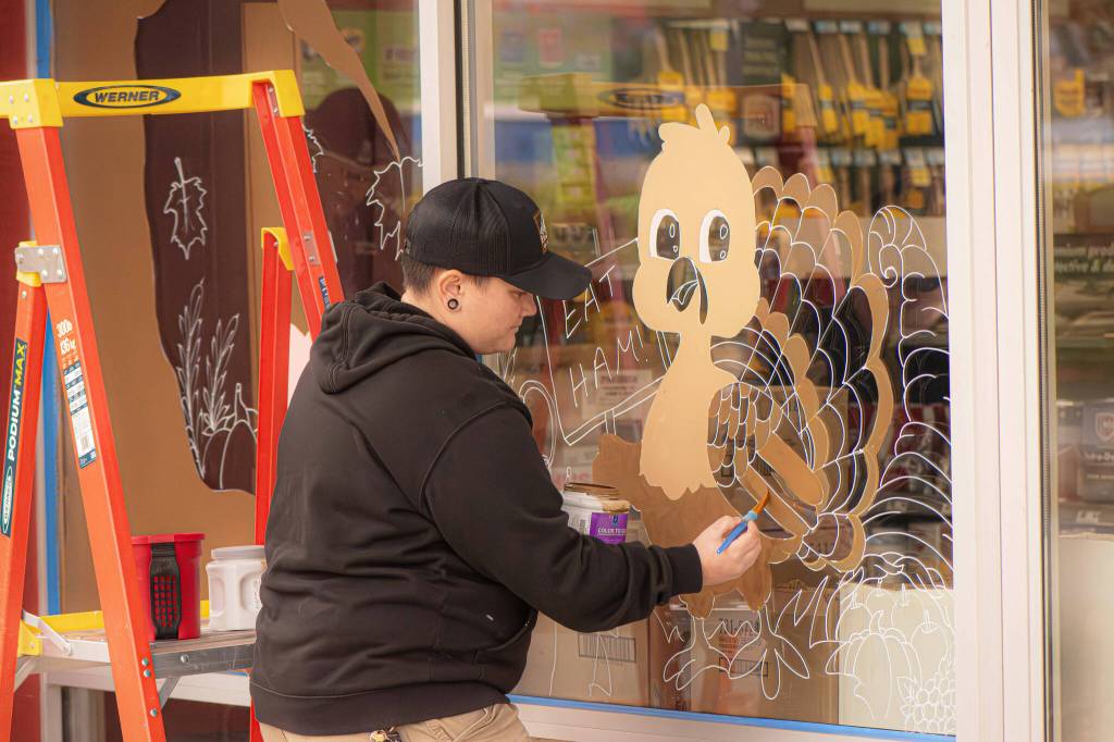 In a nod to the upcoming Thanksgiving holiday, Sherwin-Williams Paint Store employee – and artist – Halie Williams paints a humorous “EAT HAM!” message alongside a turkey on the front window of the store located at 1400 W. Washington St. Williams decorated the window for Halloween and said she intends to paint it for all major holidays going forward.