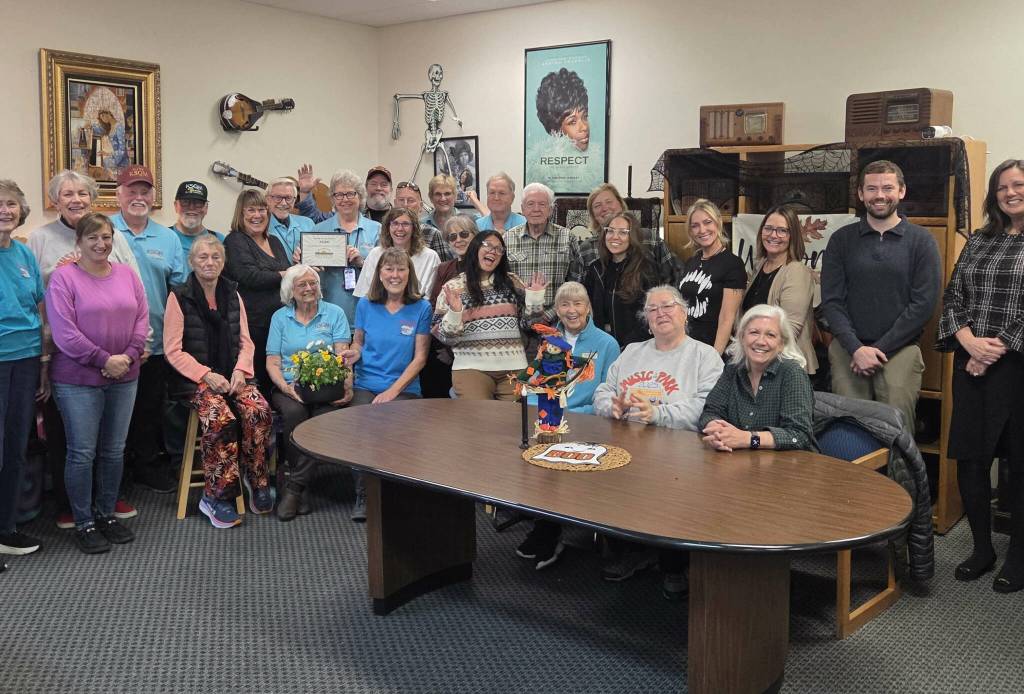 Photo courtesy Sequim-Dungeness Valley Chamber of Commerce/ KSQM 91.5 FM Radio won the honor of chamber Member of the Month for October for the station’s service to the community. The award was presented in the radio station’s Community Room, which was a packed with volunteers, staff, chamber board members and allies.