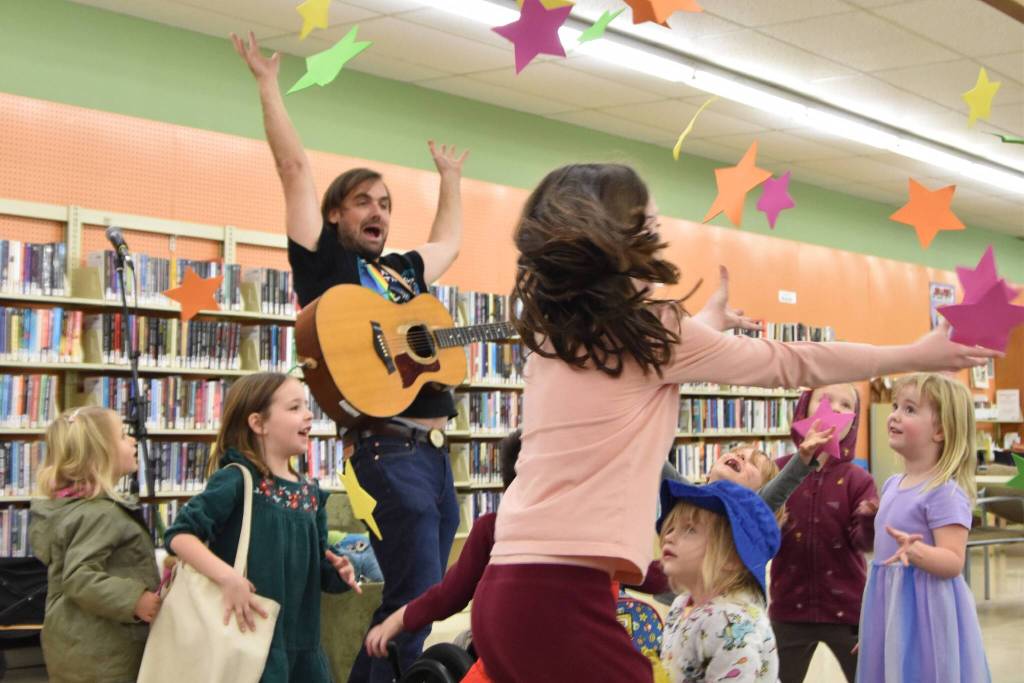 Sequim Gazette photo by Monica Berkseth/ Mikey the Rad Scientist was a hit with children at the Sequim Library on Saturday, Dec. 6, as he led them in songs and playful movements designed to spark curiosity about animals and ecosystsems. The North Olympic Library System (NOLS) sponsored the program for children ages 2-8 and their caregivers. For more information about NOLS programs for children and youth, visit NOLS.org/events, call 360-417-8500, or email youth@nols.org.