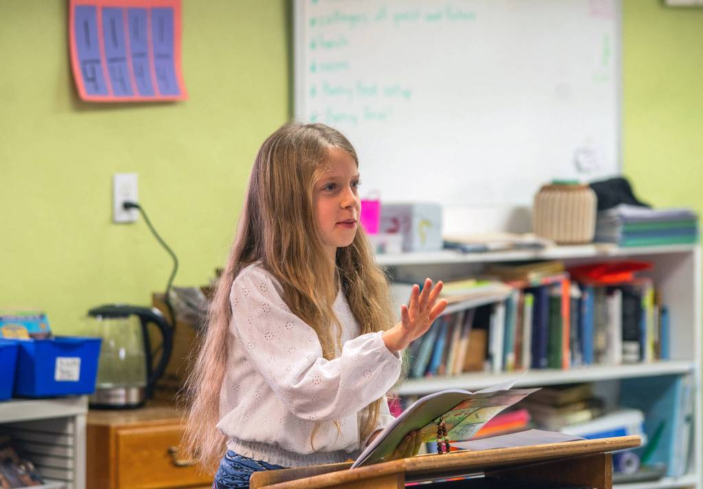 Surrounded by white paper chains and snowflakes, the mixed group of second through sixth graders each took a turn reading and then introducing the next poet before a classroom filled with peers and supportive adults and siblings.