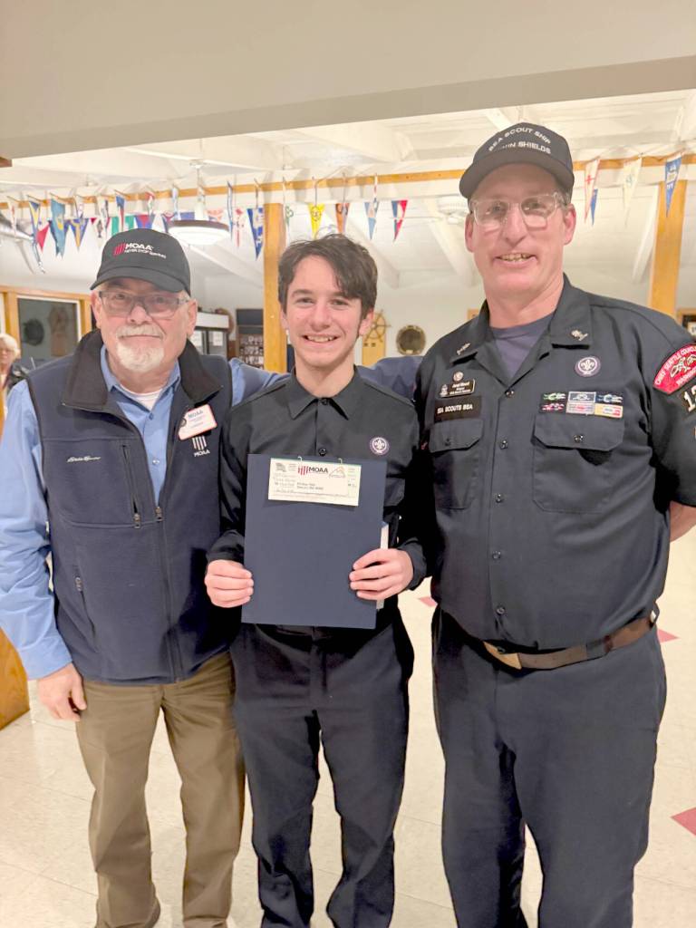 The Olympic Peninsula Chapter of the Military Officers Association of America (MOAA) recently presented the Sea Scout Ship Marvin Shields a $350 check to enable a unit member to attend the National Youth Leadership Academy. Chapter president, “J” Kinder presented Sea Scout Boatswain Sutten Desser, Scout Tristen Gordash and Ship Skipper Jared Minard with the donation from the chapter at a recent Sea Scout meeting in Port Angeles. Sea Scout Ship Marvin Shields is homeported in Port Angeles and is a unit of Scouting America that focuses on maritime training and safety, leadership, and citizenship.