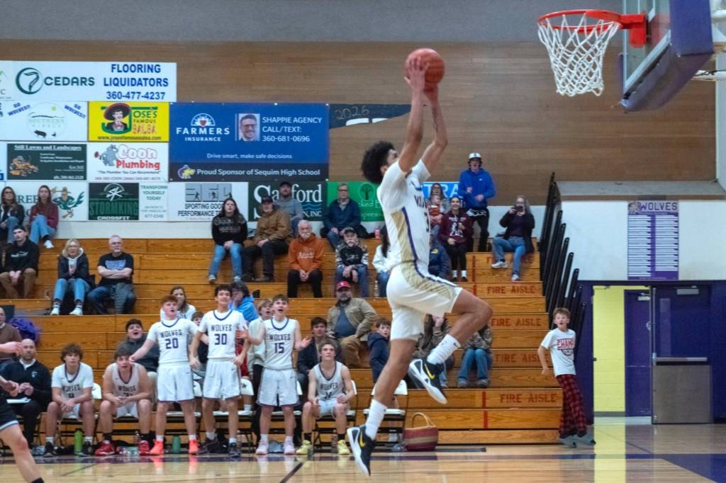 Sequim’s Solomon Sheppard goes up for a dunk in a home game against North Mason on Dec. 19. Sheppard was named to the Olympic All-League First Team.