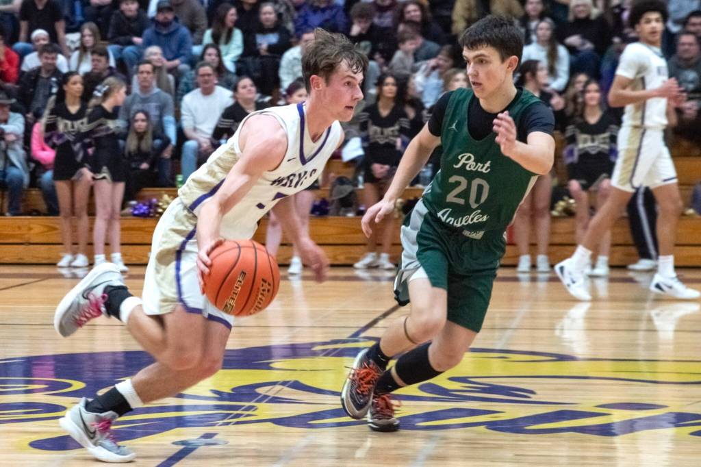 Junior Mason Rapelje zooms past Port Angeles defenders on Jan. 30 during the Rainshadow Rumble where he scored a career-high 37 points to help the Wolves win. For his strong season, he was named to the Olympic All-League’s First Team