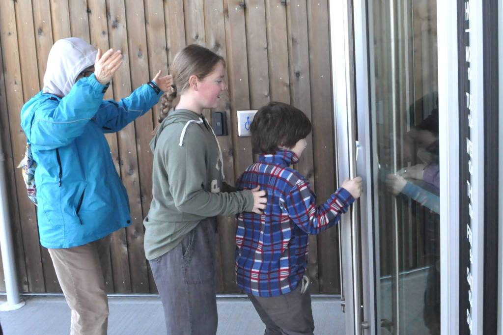 Sequim siblings Zealand Higgs, 10, and Angus Higgs, 7, were the first two patrons to officially enter the library on Saturday after a countdown led by Branch Manager Emily Sly.