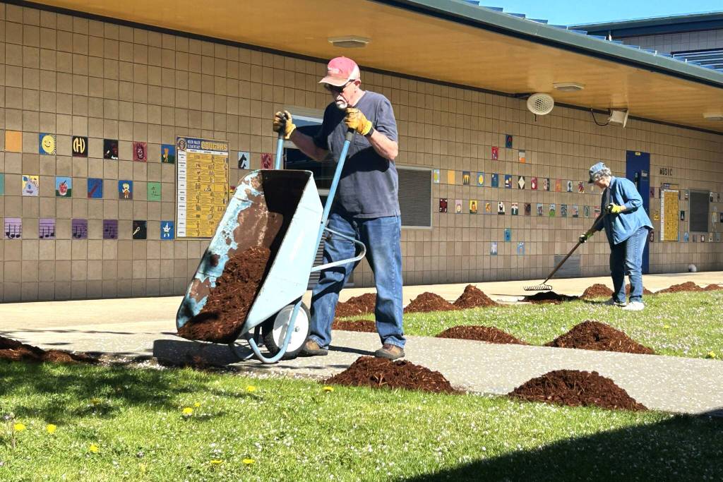 Patsy Lovelady with Dungeness Community Church helped at the event for the first time spreading bark dust courtesy Cascade Bark around Helen Haller Elementary with several volunteers.