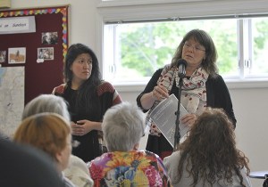 Healthy Community Coalition advocate Bertha Cooper (far left) joins fruits and vegetables (from left) Judy Hubers-Brandt (broccoli)