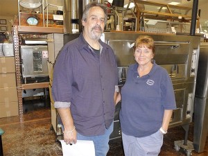 Olympic Restaurant Equipment and Supplies owner Eric Schwartz and his business manager Judi Jones pose in front of a large commercial oven.