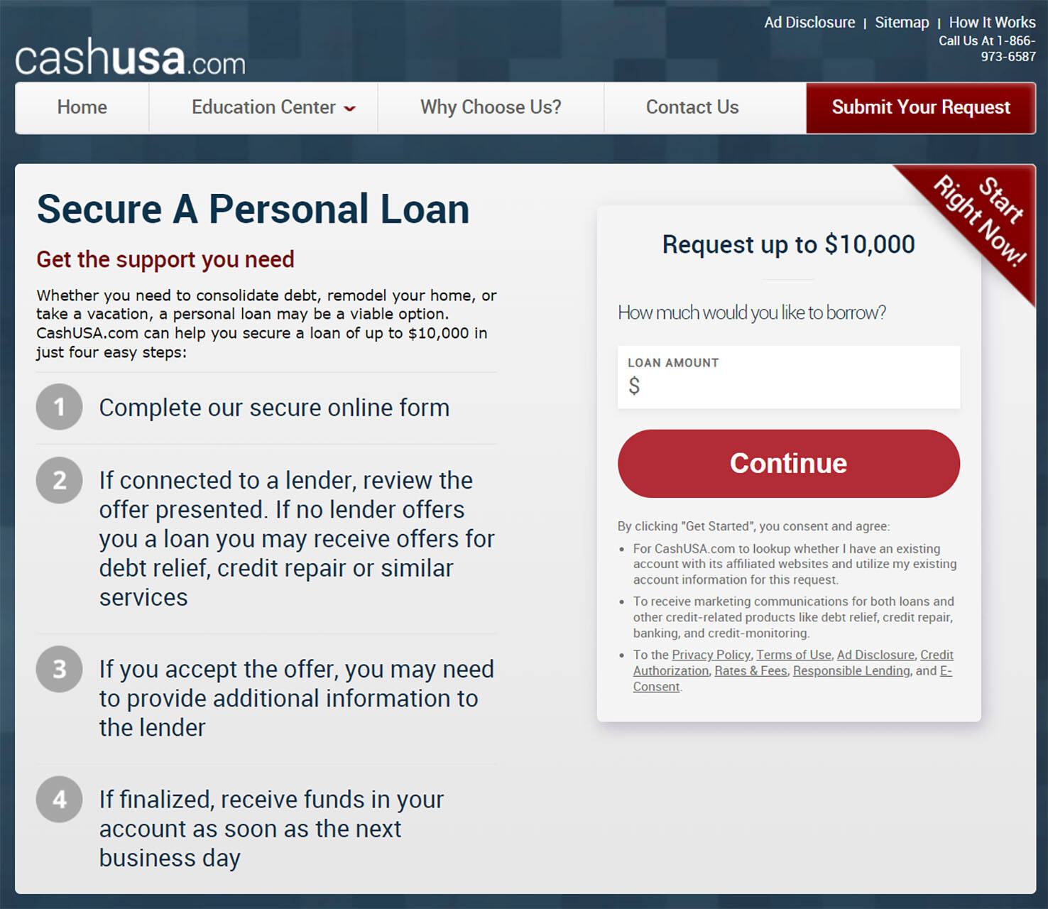 You can get up to $10,000 from various online lenders if you submit your information through the CashUSA website. They boast of having reliable lenders in their network that offer quick approval and funding every time you apply for a loan.