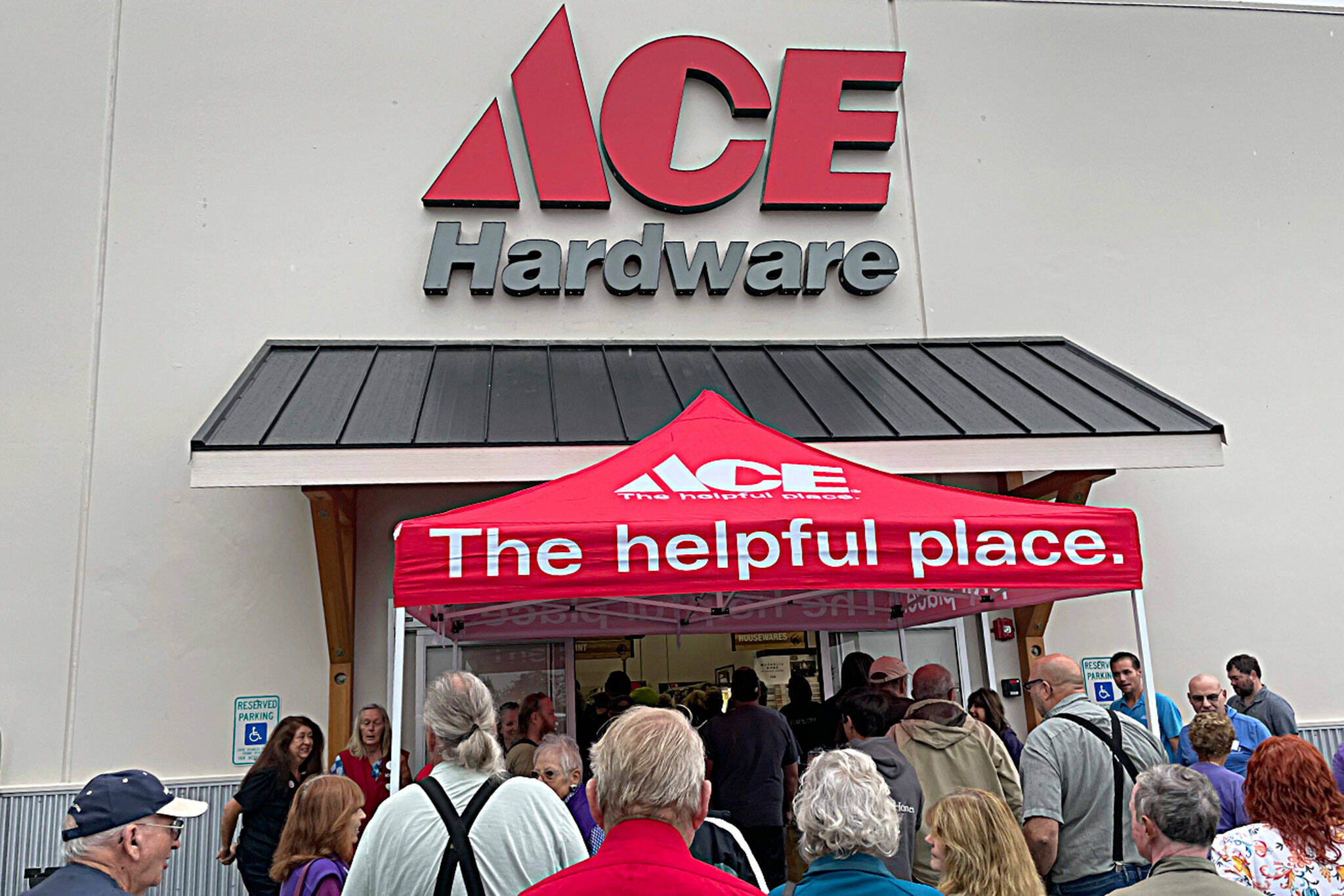 Store manager Bill McClansburgh cut the chamber’s ribbon and sawed an “Ace Hardware” sign on Aug. 31 to commemorate the new store at 232 Valley Center Place in Carlsborg.