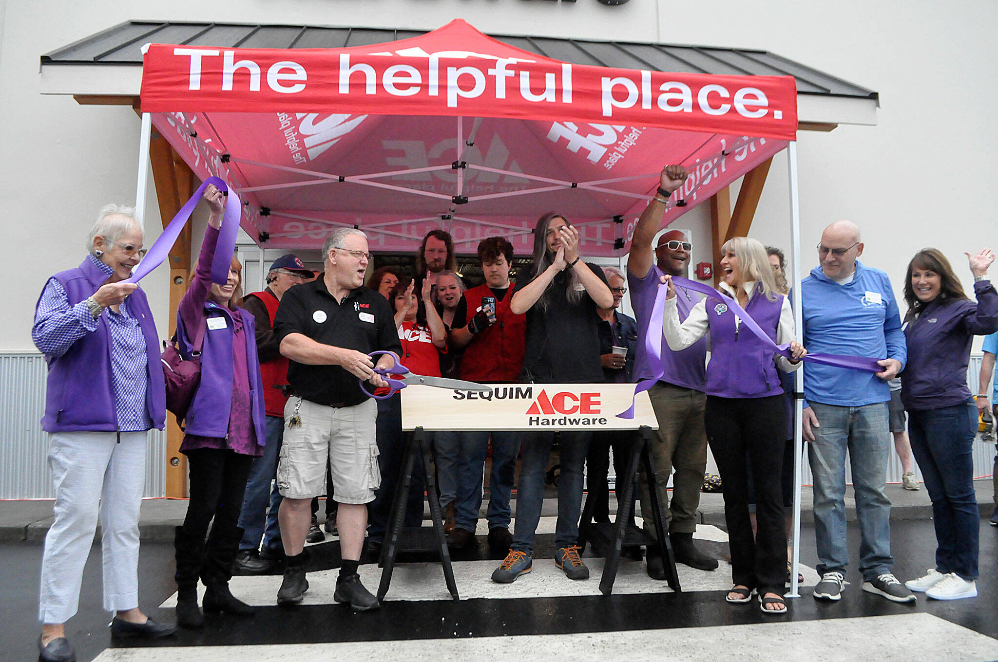To commemorate the opening of Sequim Ace Hardware, staff and Sequim-Dungeness Valley Chamber of Commerce representatives held joint ribbon cutting and sign sawing ceremonies.