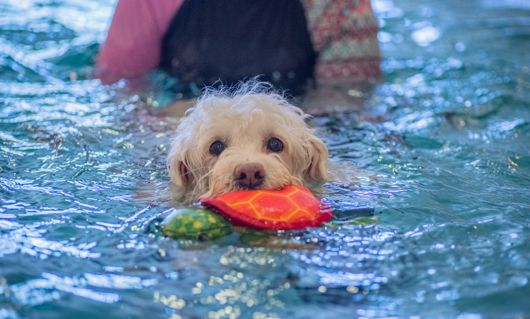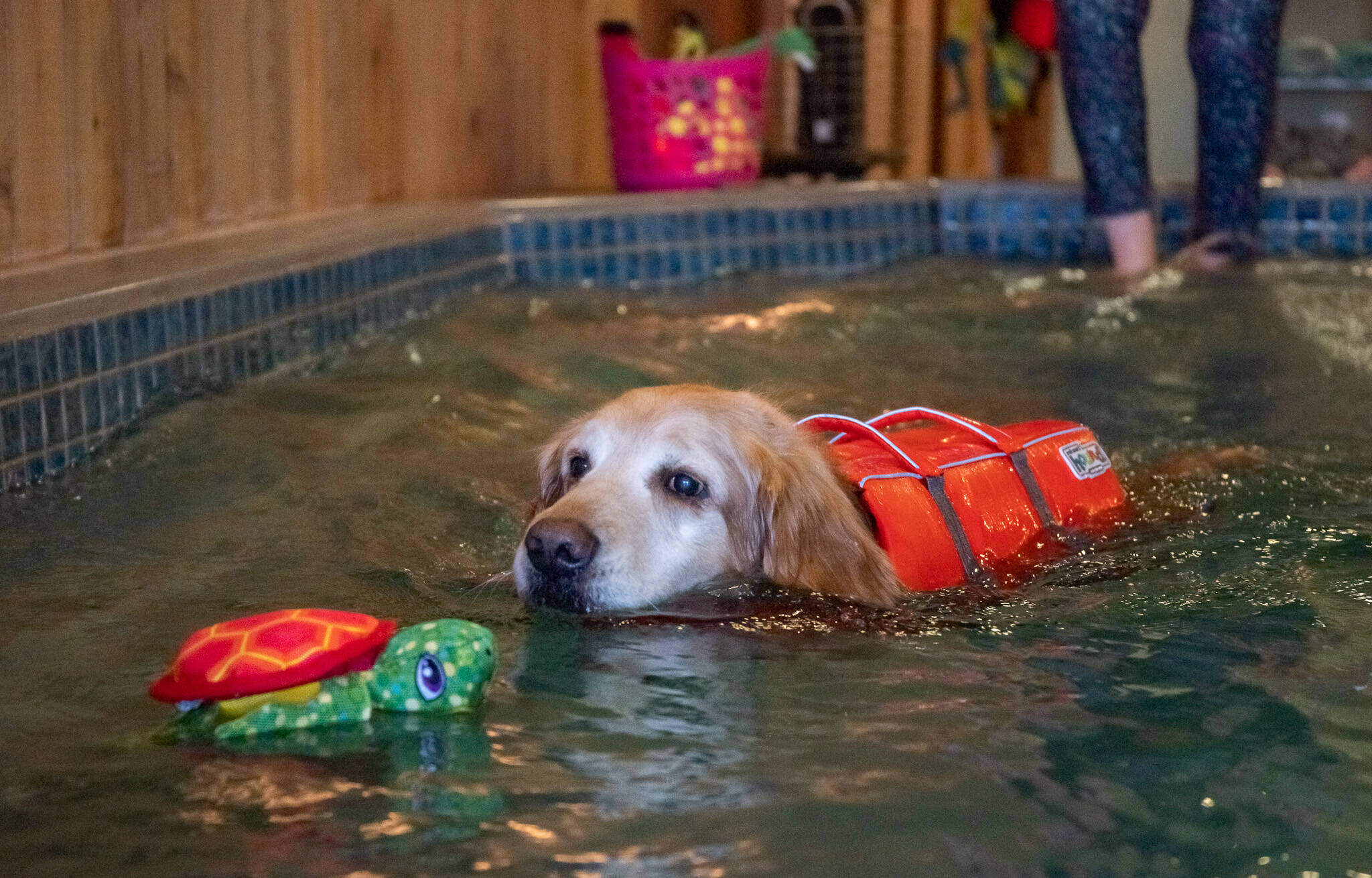The pool is cleaned and sanitized using a system combining ultra-violet light, hydrogen peroxide and triple filtration. It is kept at 92 degrees, which Avery said is ideal for dog therapy, and has a current that can be switched on to challenge those dogs that need it.