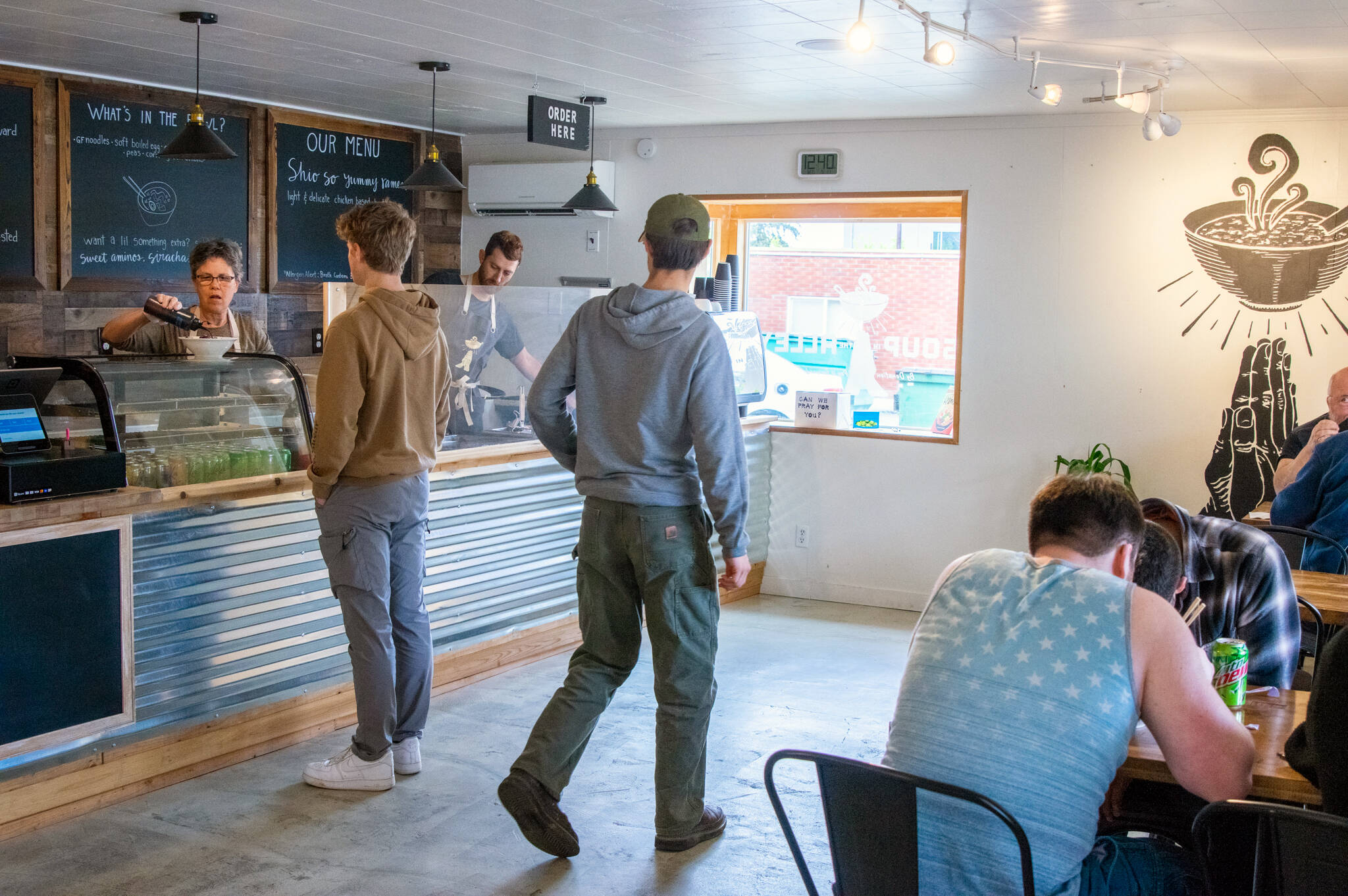On the one month anniversary of the April 11 opening of Soup in the Alley, three high school students sat at one of four occupied tables, enjoying the ramen and the atmosphere during their 30 minute lunch break. Keaton King, Juan Torres and Cypress Byrne all emphasized the positive environment as one of the reasons they’ve eaten there 10 times since it opened.