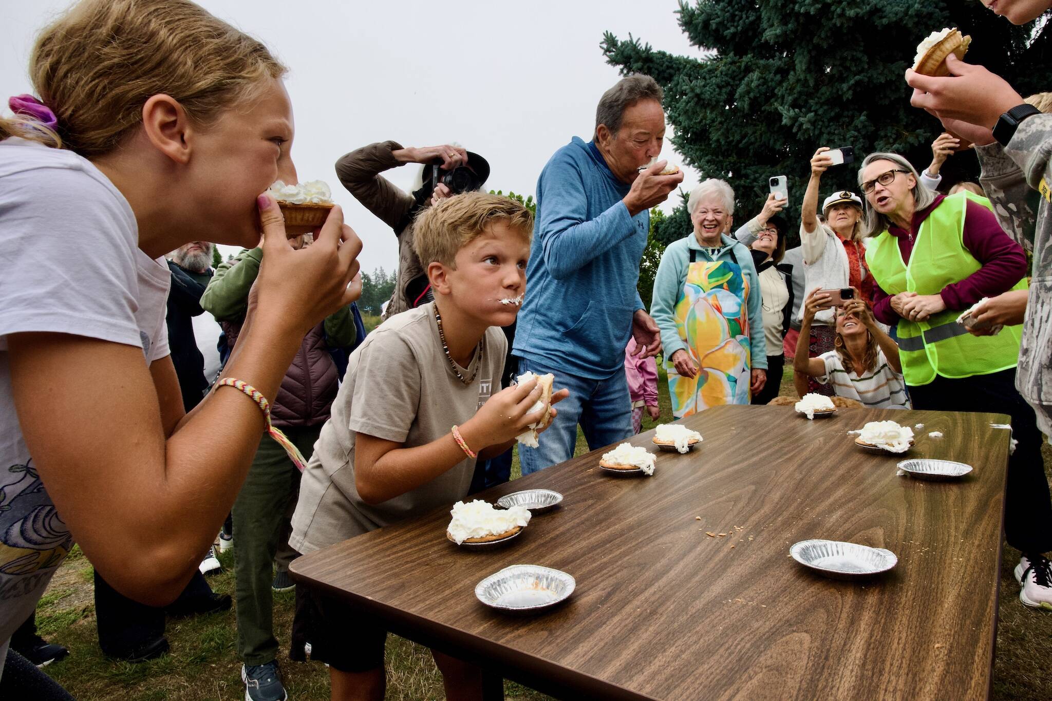Haley Dyck, left and her brother Callum Dyck participate in a pie-eating contest Saturday at Sunland as judge and moderator Don Harris (in yellow vest) keeps a close eye on competitors. “It was intense,” Harris said of the friendly competition.