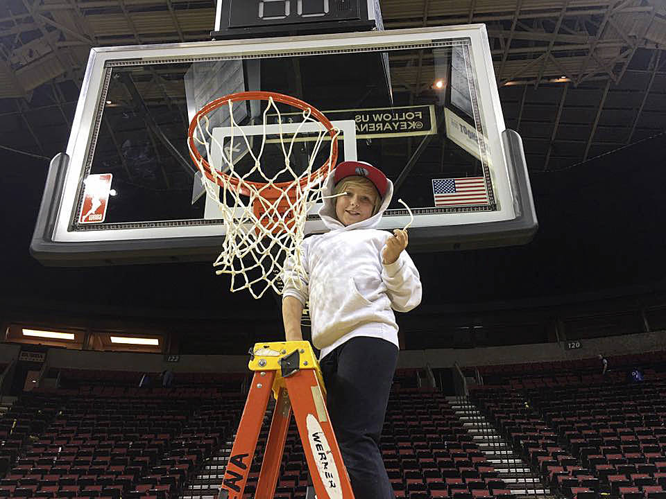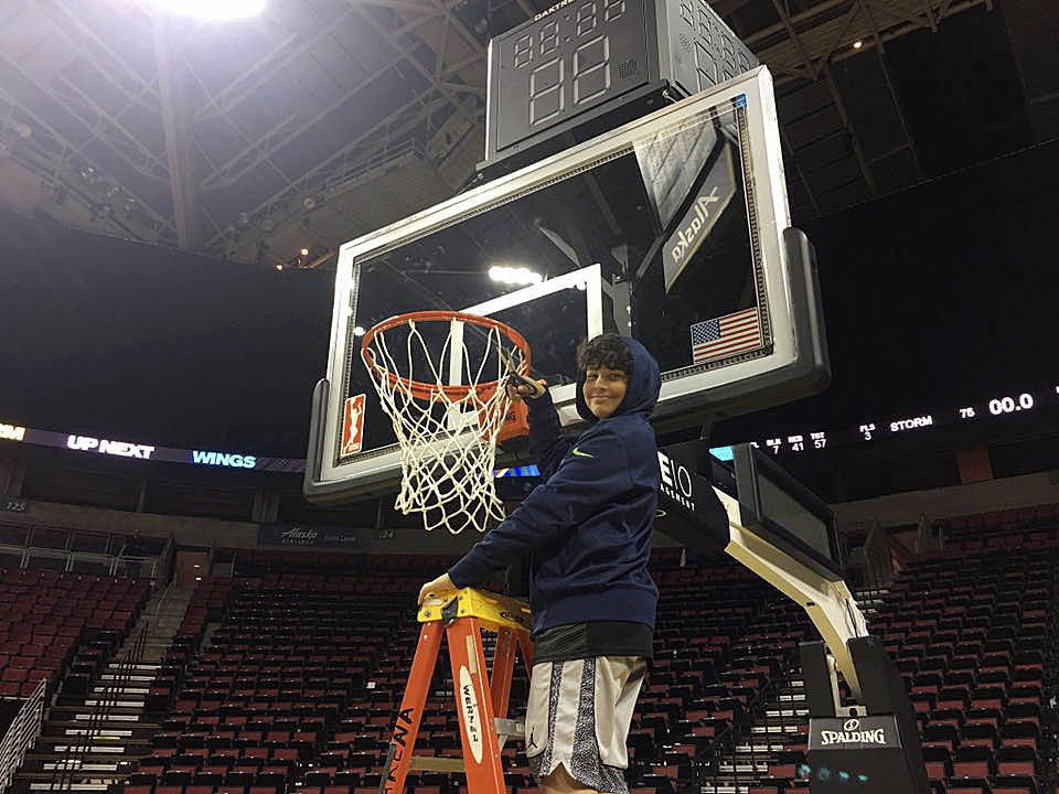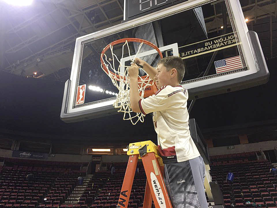 Kaiden Tosland cuts down a net after he and fellow Boys & Girls Club campers enjoyed a Seattle Storm basketball game last week. Submitted photo