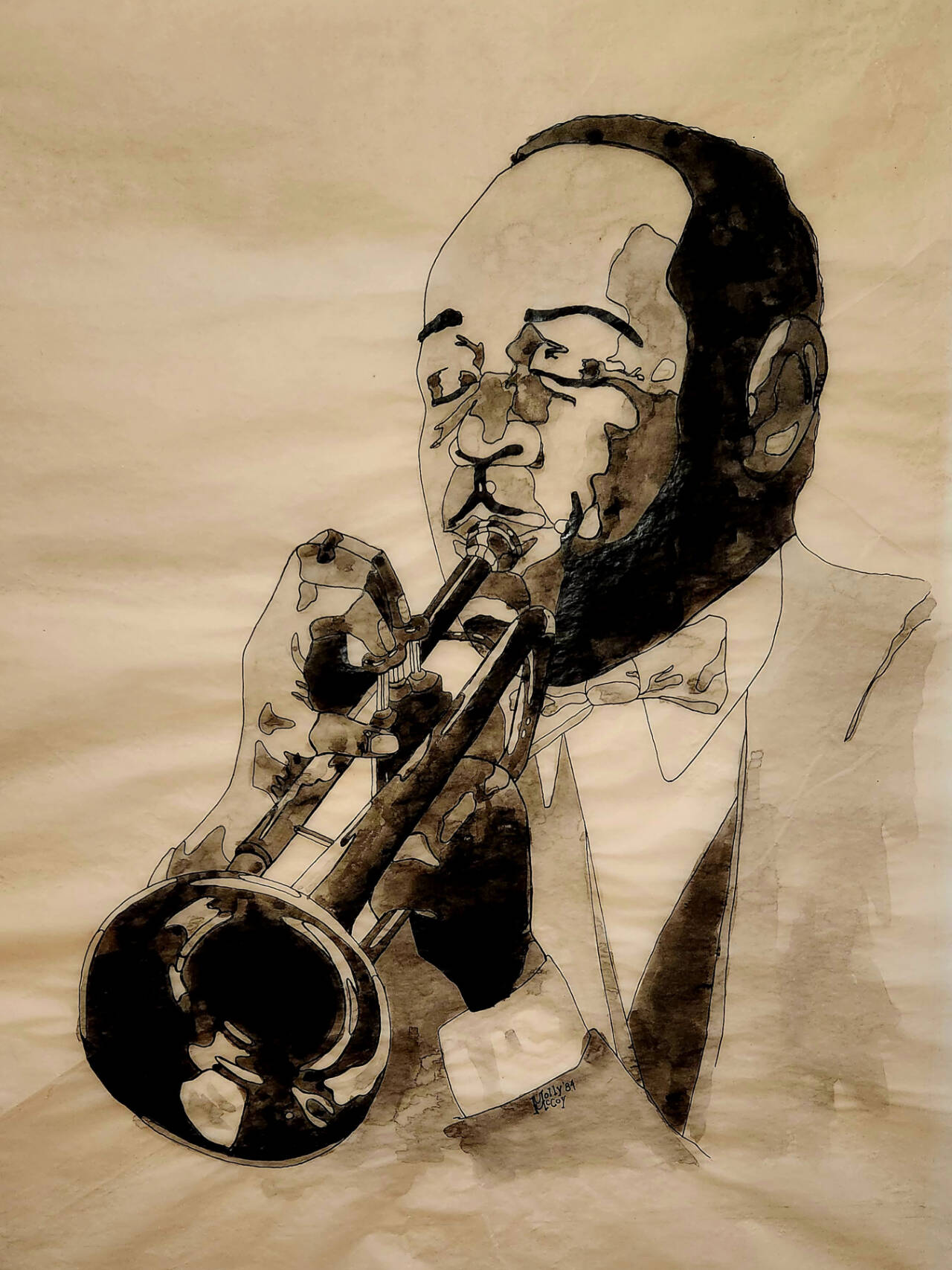 Art courtesy of Molly Omann / “Satchmo," a pen-and-ink drawing by Molly Omann, is on display with other pieces in the exhibit “Music; The Art of Arranging Sound,” featured at the Sequim Civic Center on the First Friday Art Walk and from July 7-Sept. 25.