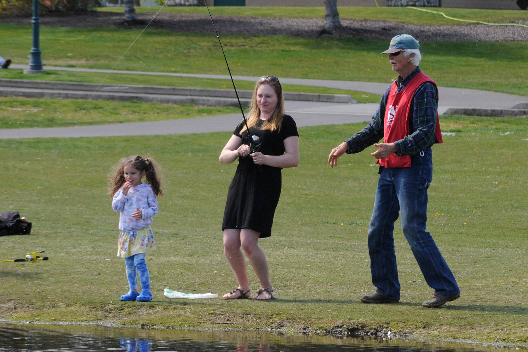 Puget Sound Anglers-North Olympic Peninsula Chapter hosted six hours of free fishing at the reclamation pond north of Carrie Blake Community Park with ready-to-use poles, help with bait and hooks, and cleaning, icing and bagging each rainbow trout caught.