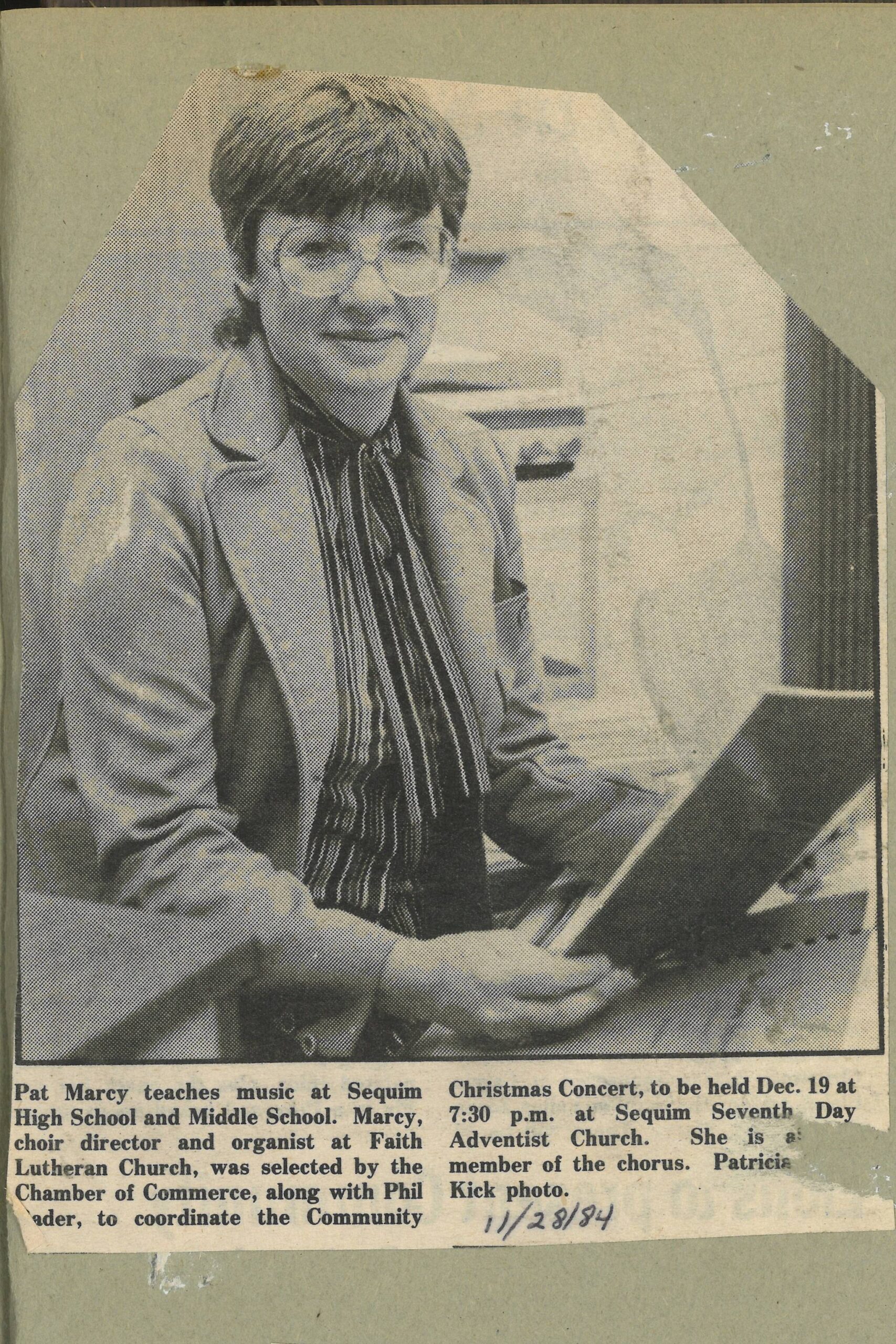 Marcy also led the Sequim Community Christmas Chorus for eight years and was an accompanying pianist for the Port Angeles Light Opera Association, Port Angeles Community Chorus, Peninsula Singers, Olympia Theatre Arts, and Reader’s Theatre for a number of shows each.