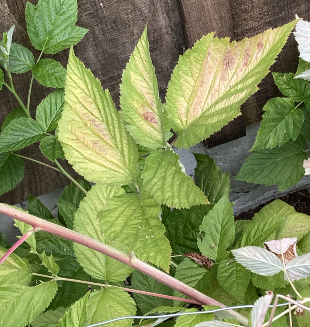 What’s wrong with my raspberry bushes? The leaves toward the bottom of several canes have turned yellow and brown in the middle and some of the berries have white spots (see photos).