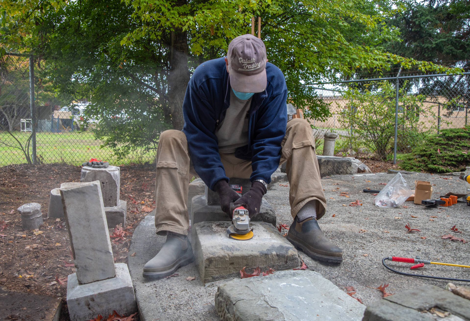 In general, power tools aren’t used during cemetery restorations, according to Marion “Mick” Hersey, National Historical Preservationist. In this case, Roy Harlson is using (?) to grind away old mortar from a base stone which had been combined with an unmatching headstone. This mistake was made in the 1960s when a memorial corner was created in the corner of Sequim Pioneer Memorial Park. Members of the Sequim Prairie Garden Club and Michael Trebert Chapter of the DAR, as well as other volunteers, worked to fix past mistakes and vandalism under the tutelage of Hersey this autumn and will finish their work in the spring. Sequim Gazette photo by Emily Matthiessen