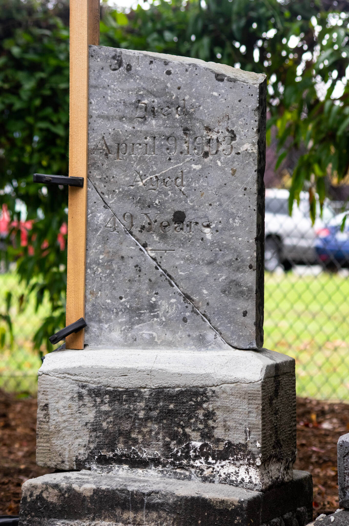 Hersey said that next spring when the air is warm enough, Lithomex will be applied to seal the uneven areas between the headstones and bases.