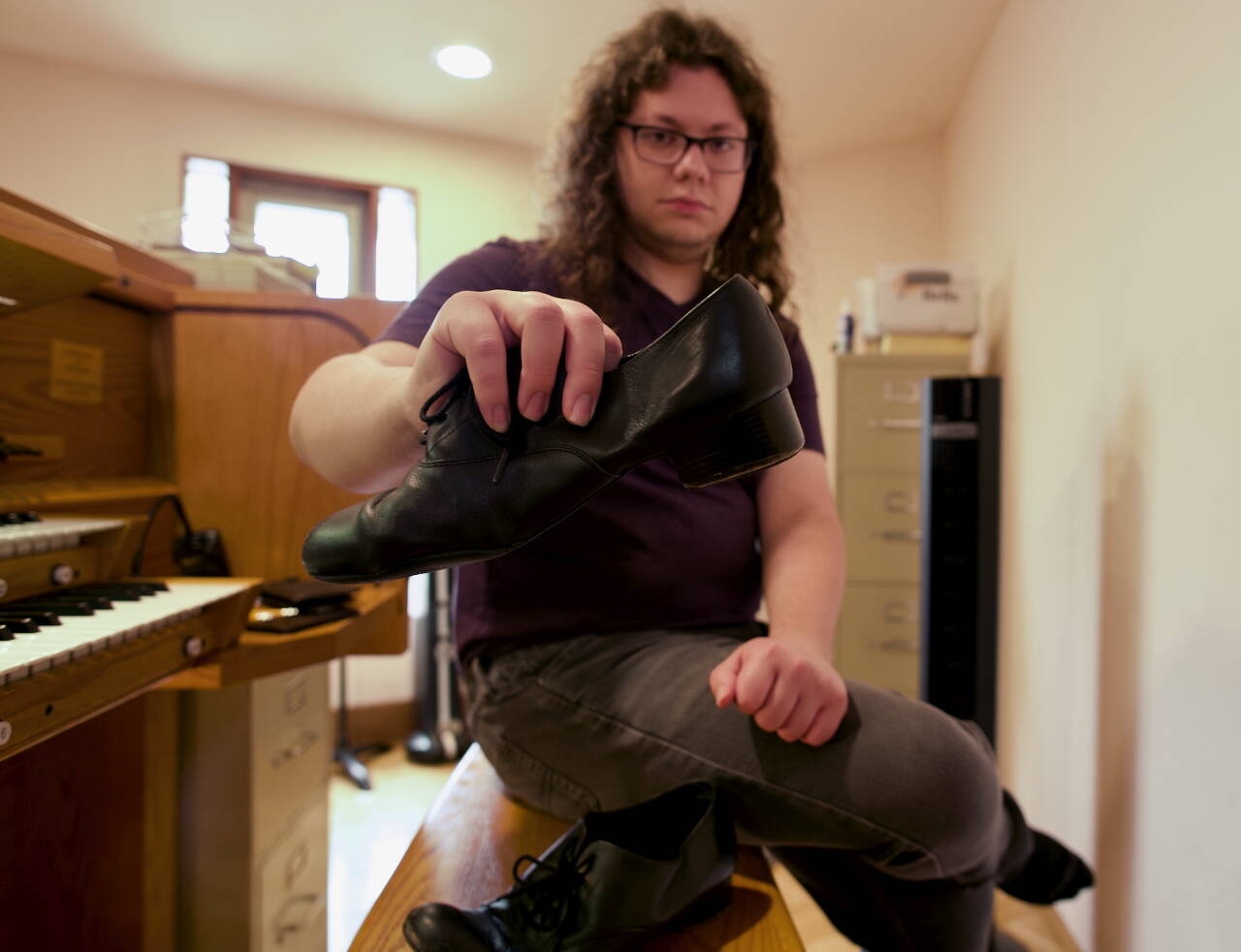 “The shoes have a narrow toe, and a wooden block on the heel, and suede on the bottom” he said. “These help you for playing (the organ) with your feet. So, with your narrow toe, you have more accuracy. The pedal board allows for deep bass notes, and a skilled organist can play entire passages with their feet alone — a technique that has evolved over centuries.