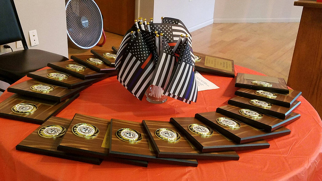 Among those honored by the Olympic Peninsula chapter International Footprint Association are (back row, from left) Border Patrol Agent in Charge Corey Lindsay, Border Patrol Agent Daniel Ervin Yarbrough, fire marshal Mike Sanders, firefighter/paramedic Tyler Gage, firefighter/paramedic Michael Stroobant of the Port Angeles Fire Department, and chief Jake Patterson and lieutenant Kevin Thompson of Fire District 2, with (front row, from left) police chief Sheri Crain, deputy chief Mike Hill of the Sequim Police Department, Border agent Daniel Janikic, Clallam County Sheriff Bill Benedict, officer Eric Walker, police chief Chief Brian Smith and officer Swift Sanchez of the Port Angeles Angeles Police Department, and communications officers Jessica Conner and Chelsea Jensen of PenCom. Not pictured are officer Jeff Thaxton and detective Rick Larsen of the Sequim Police Department, deputy Ben Tomco and detective Jeff Waterhouse of the Clallam County Sheriff’s Office, corrections officer Lex Prose of the Forks Police Department, trooper Mark Hodgson of the Washington State Patrol, corrections officer Laura Mabrey of the Clallam Bay Corrections Center, EMT volunteer Chaela Sumner from Clallam County Fire District 3, and advanced EMT/quartermaster Carolyn Flint of Clallam County Fire District 4. Submitted photo