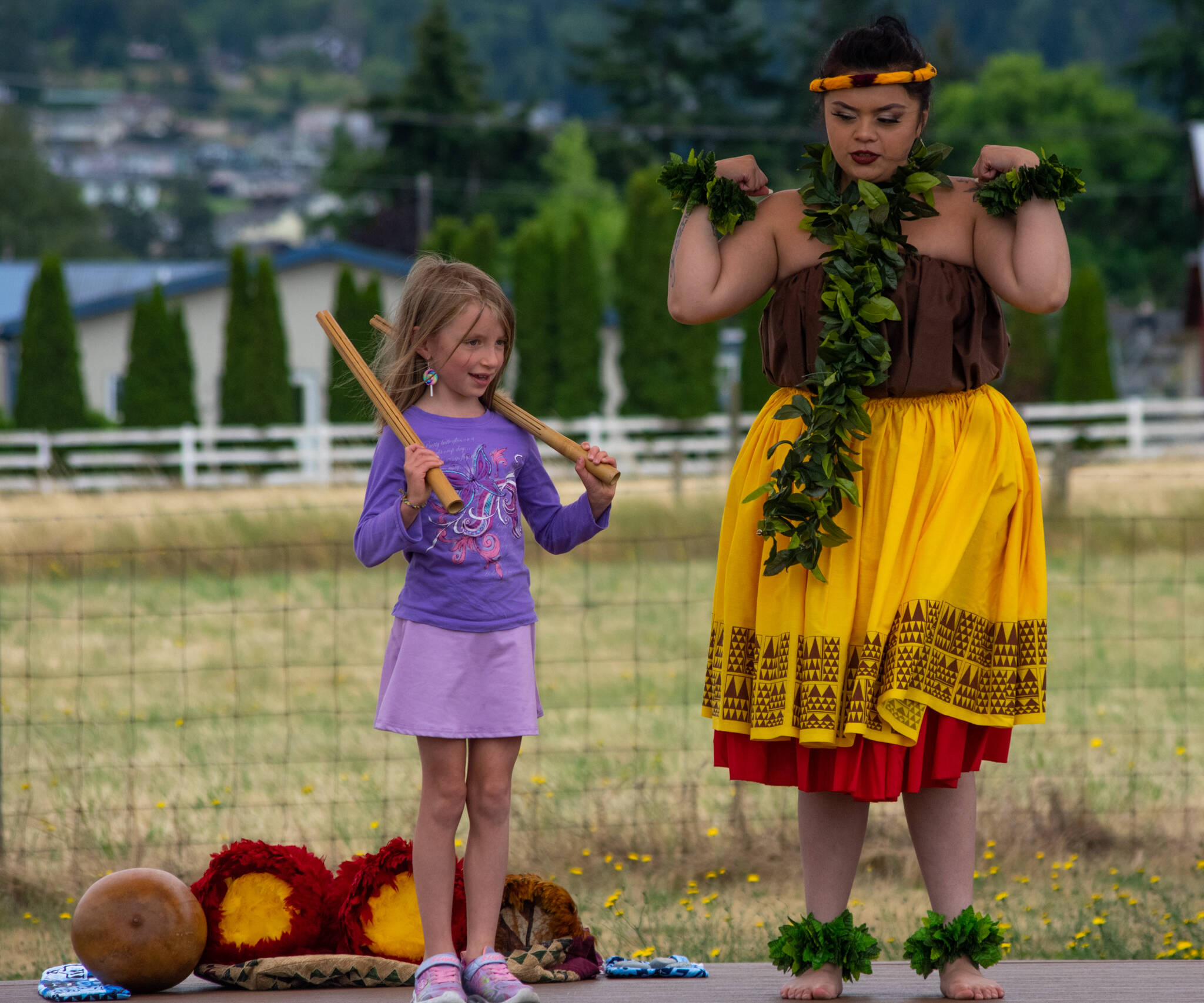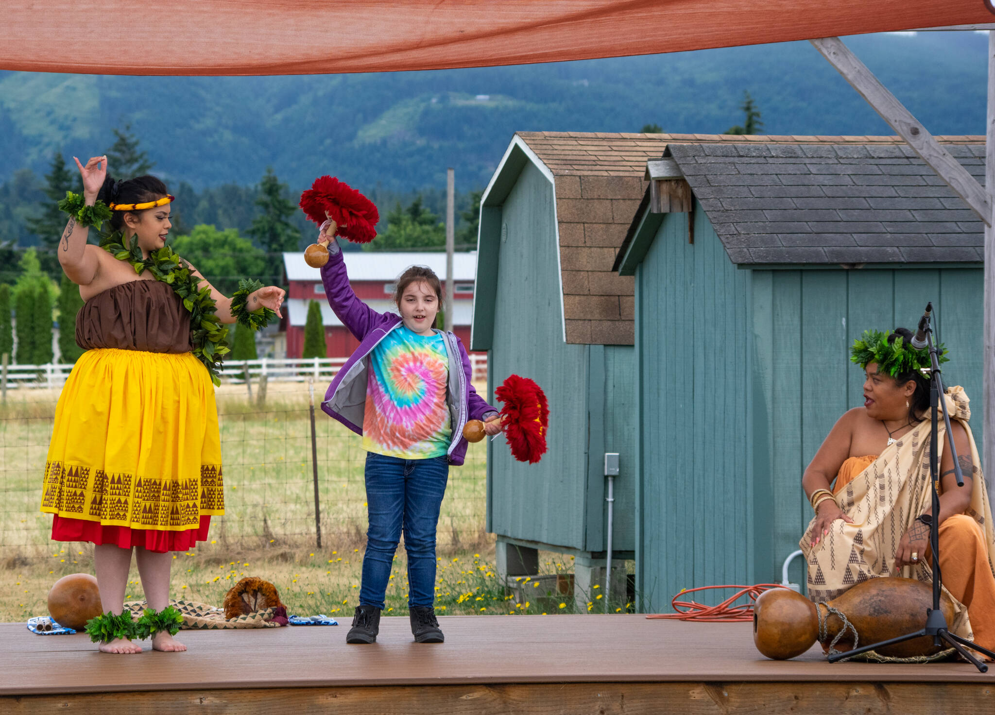 Skye Kading, 7, volunteered to try out the instrument called pū’ili on the stage, which was located in the field behind the library.