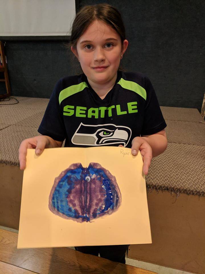 Art projects included making scarecrows from brown bags, painting paper and folding it in half to make symmetrical blobs, to which they added googly eyes. They created their own glow-in the dark slime.