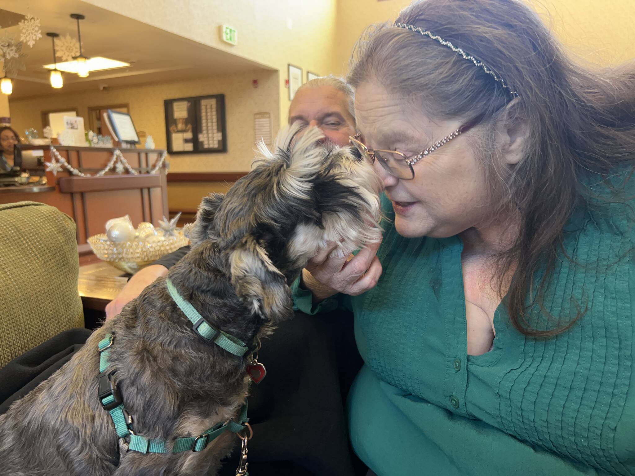 Huffman said it “means so much” when dogs are brought to Sequim Health & Rehabilitation. Staff members sometimes bring their own pets and occasionally volunteers bring them, but now there is an actual certified therapy dog at the facility: Jazmine, a Miniature Schnauzer owned by staffer Lyndon Crabtree.