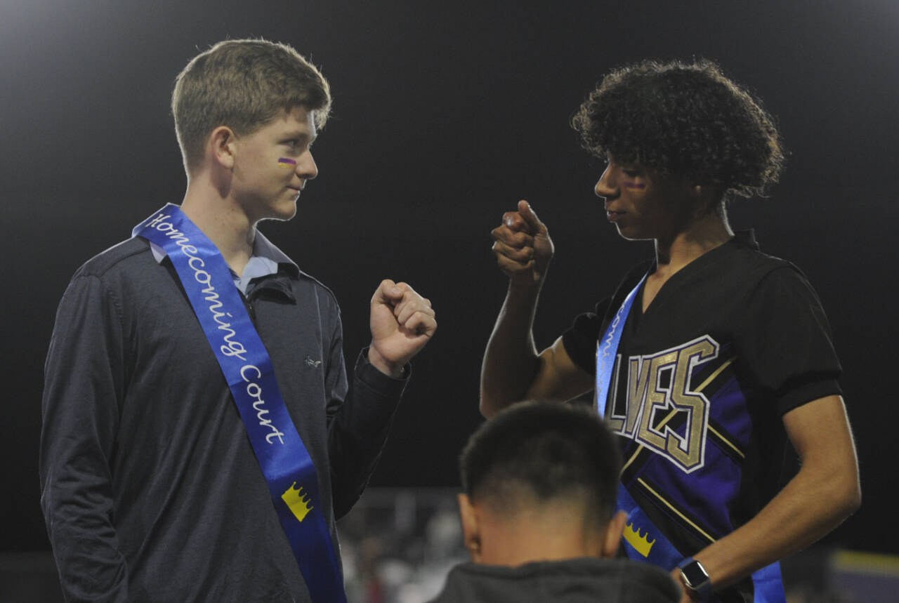 Sequim Gazette photo by Michael Dashiell / Sequim High School celebrated their Homecoming — and Homecoming royalty — at halftime of the Sept. 27 football game against rival Port Angeles. The Wolves topped rival Port Angeles 27-7 in their annual Rainshadow Rumble game. Pictured are Homecoming King Israel Torres and Queen Paige (Skylar) Krzyworz.
