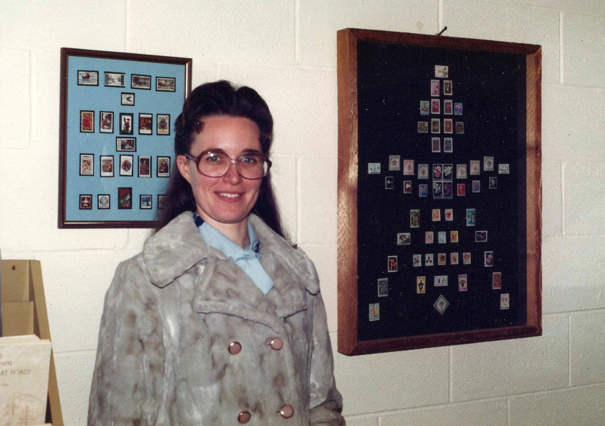 Image courtesy Strait Stamp Society/ Cathie Osborne, a founding member of the Strait Stamp Society, stands by some displays in 1981 during a club meeting. She continues to organize the club’s annual free show set for Aug. 5.