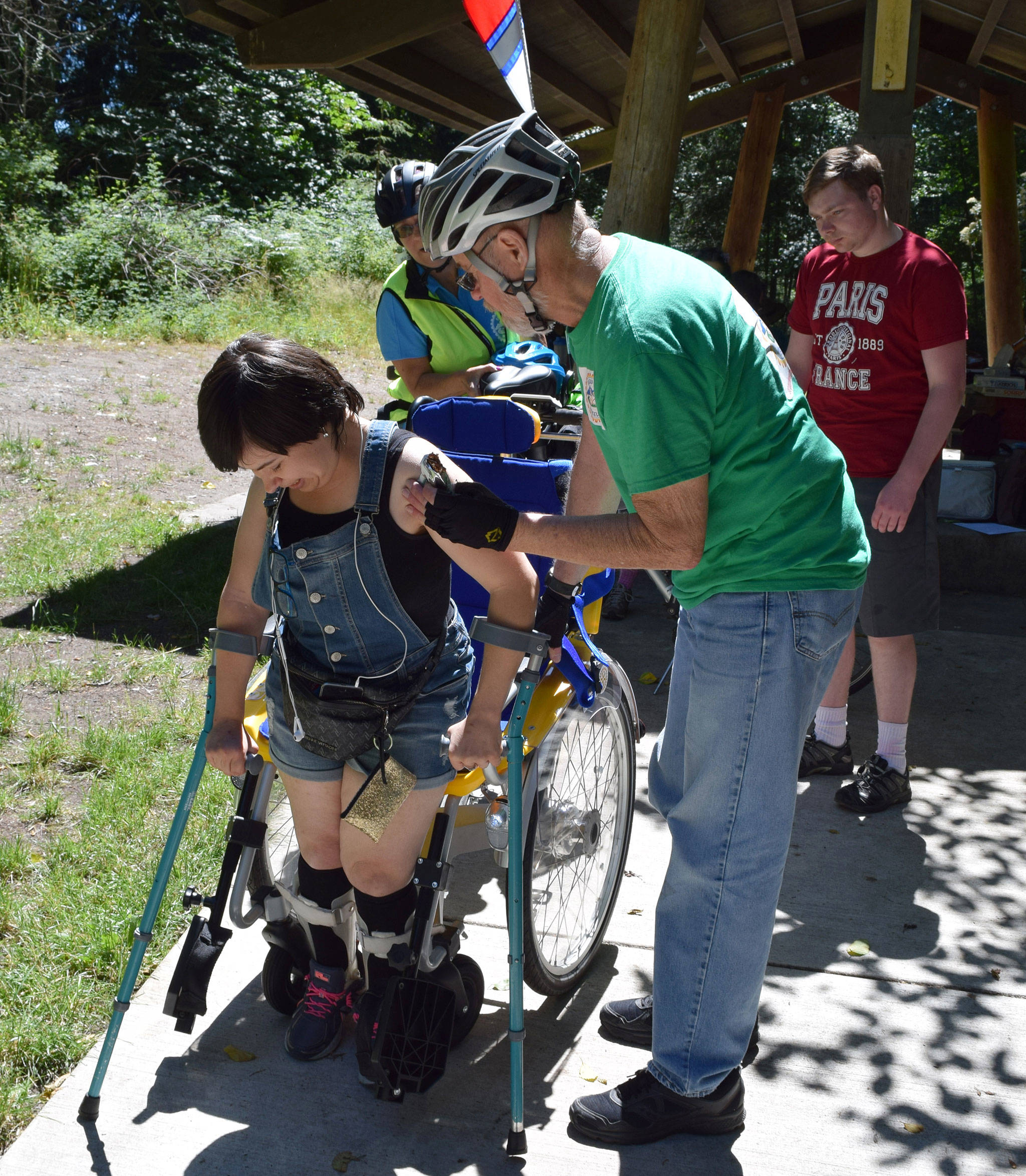 As part of its annual field trip to Railroad Bridge Park and the Dungeness River Audubon Center, five participants from Clallam Mosaic received rides from Sequim Wheelers’ volunteers on July 13. The wheelchair bike is stored at the Dungeness River Audubon Center where clients meet the Wheelers and free rides start.