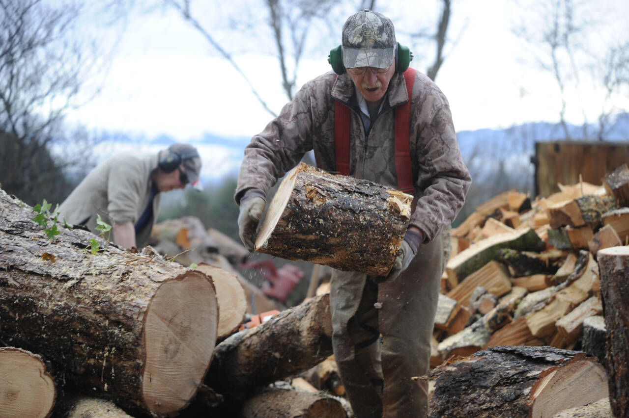 Sequim Gazette photo by Michael Dashiell / Wally Jenkins tosses a piece of wood into a pile as he and fellow woodcutters compile cords of firewood to sell, using the funds for the Path From Poverty nonprofit.