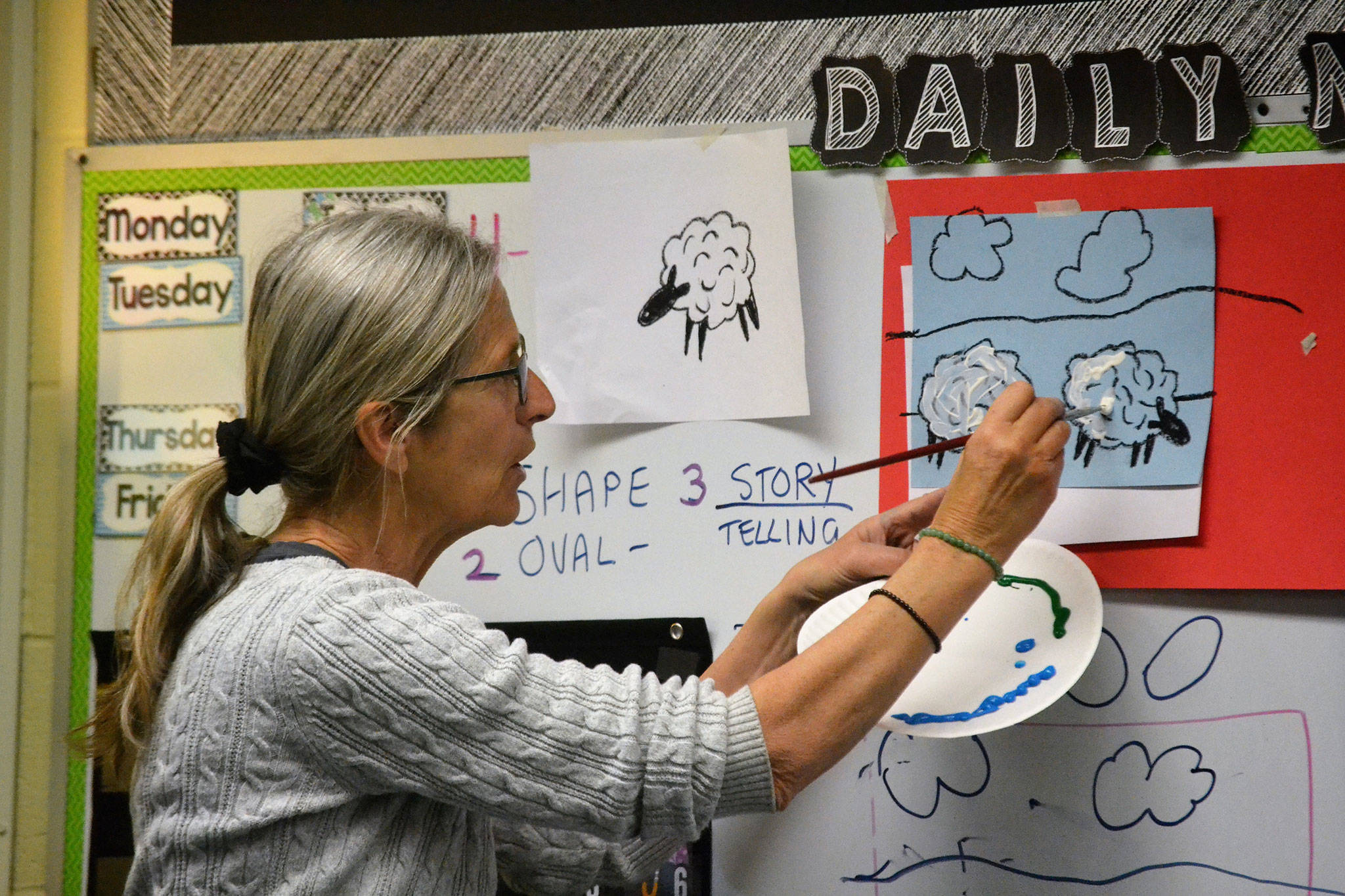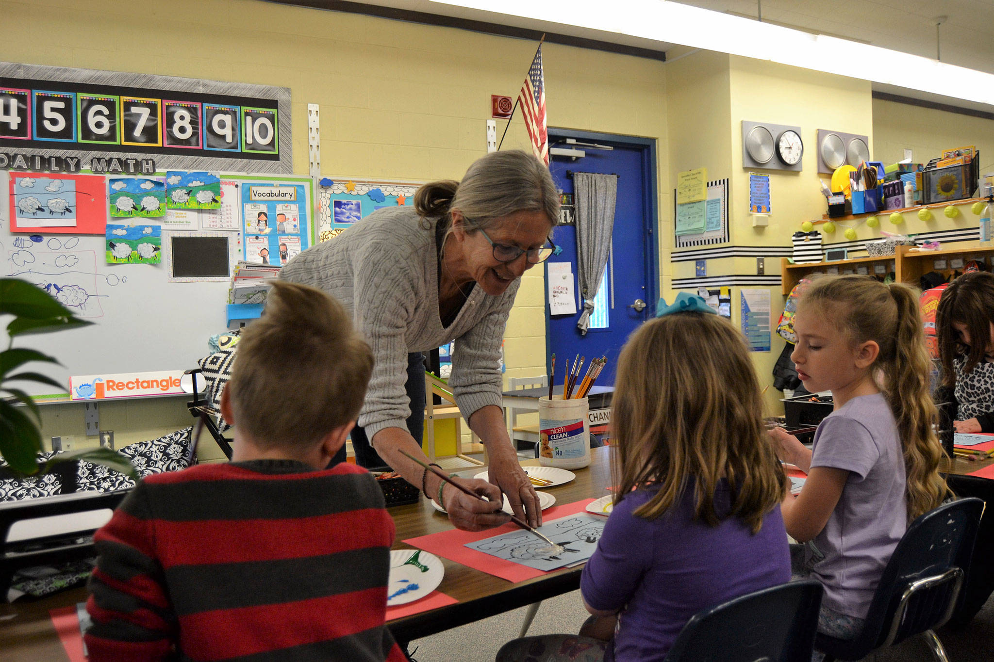 Helen Haller Elementary kindergartners in Stephanie Grotzke-Nash’s class listen in for advice from Carrie Rodlend about how best to paint a sheep. When she’s not teaching art in classrooms, Rodlend works with children and adults in Dungeness making art. Her latest show on April 20 at 562 Holgerson Road focuses on land- and seascapes. Sequim Gazette photo by Matthew Nash
