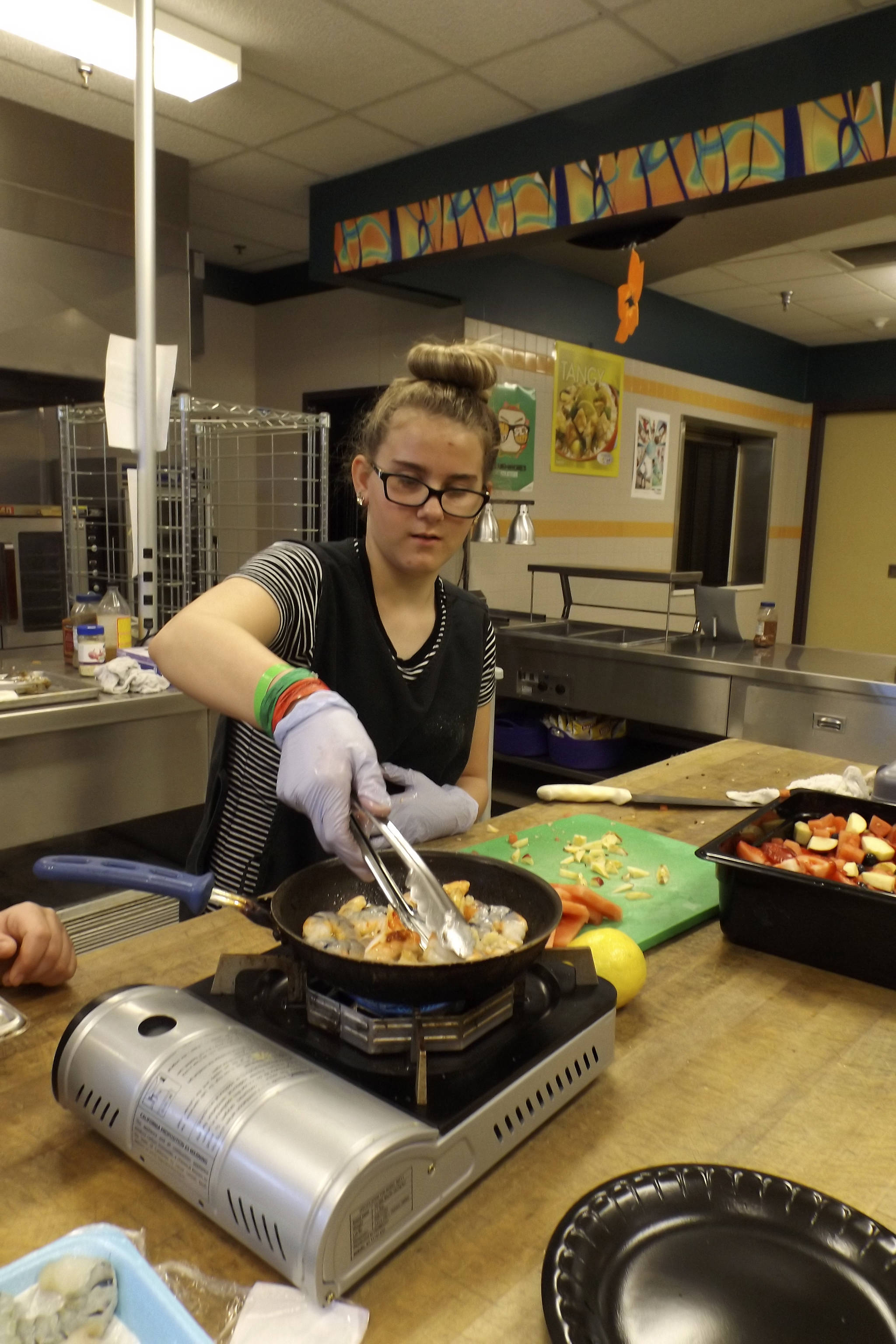 Each student received a bag with a protein such as fish, prawns, beef, pork or chicken. They had to cook this protein and also prepare a side dish that included sun-dried tomatoes. They were allotted one hour to prepare and present their meal to parents and staff members.