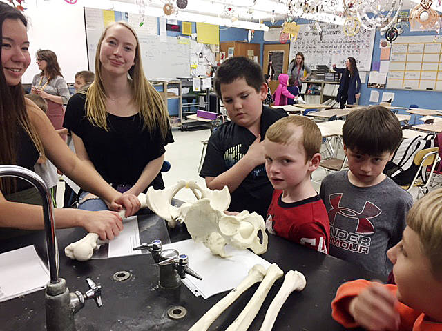 Second grade students from Helen Haller had the opportunity to visit Issac Rapelje’s science class at Sequim High School, and learn from high school experts. Stations were set up for the students to have hands-on experiences that expanded the understanding and knowledge of the many systems. Students were able to hold and examine a real sheep’s heart and eyes. They had experiences to discover the four chambers of the heart, reflexes, bones, nervous system and the senses, digestive system and models of all the body organs. The second-grade students are very thankful for this opportunity as it brought their learning to life.