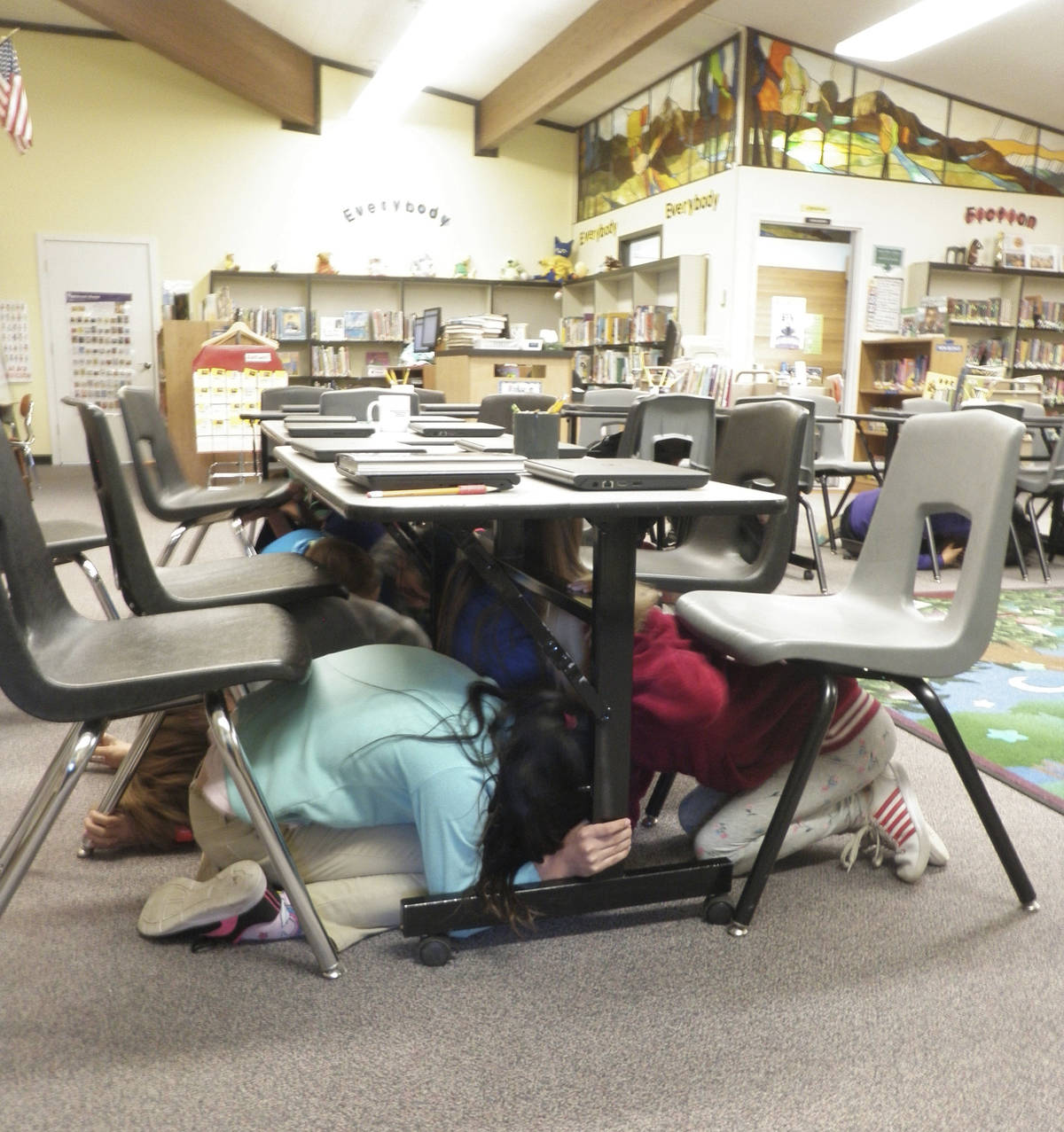 Fourth-graders at Halen Haller Elementary School take cover under library tables as Great Washington Shake Out earthquake drill begins. Photo by Patsene Dashiell