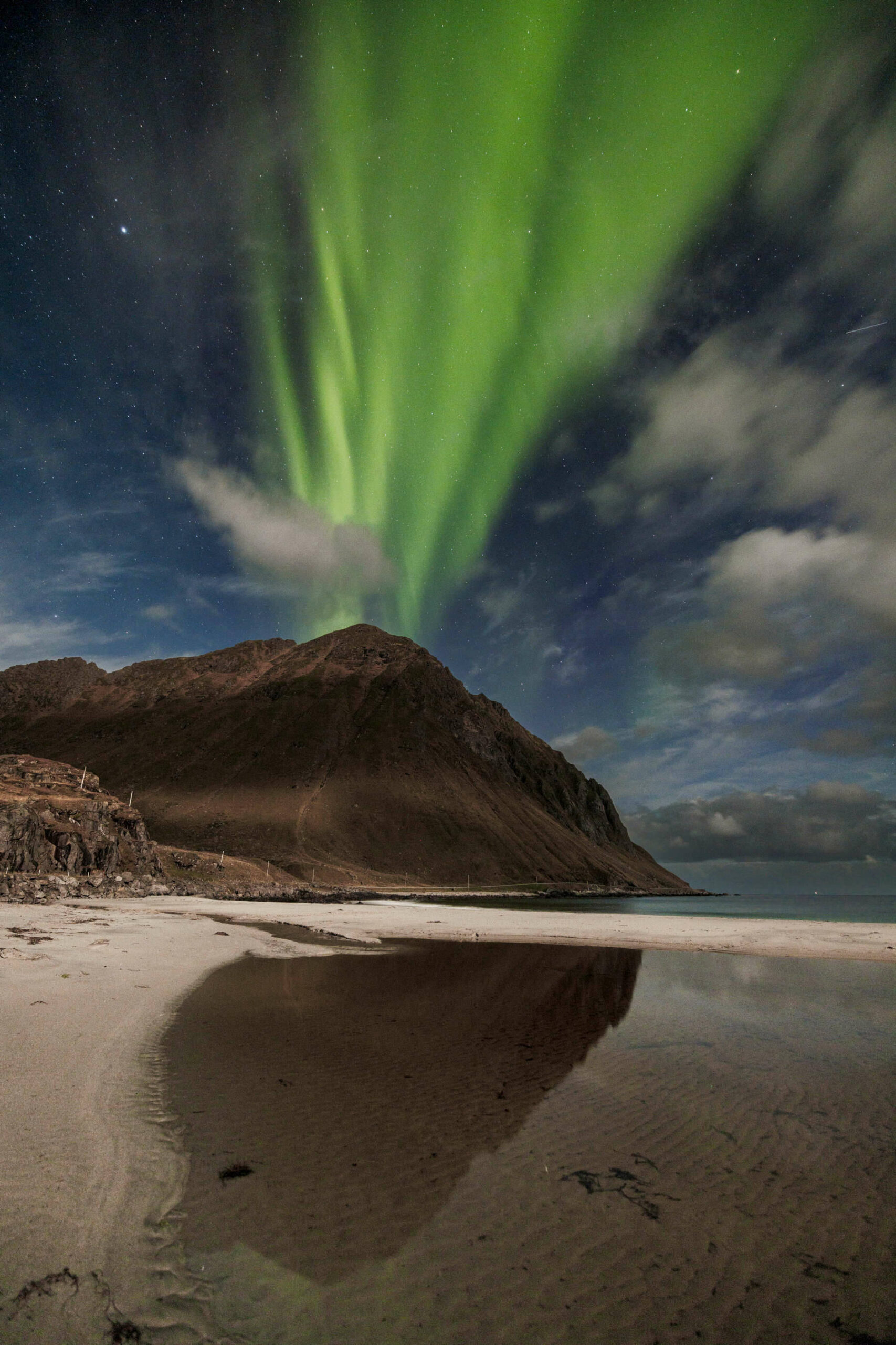 At Storsandnes Beach, I set up my camera two nights in a row during rain breaks. Around midnight on the second night, in complete solitude, the sky exploded with color. Vibrant green and purple ribbons rippled and twisted overhead—a fleeting spectacle that felt deeply personal, as if nature had prepared it just for me. These moments are rare and precious, the kind of beauty that isn’t handed to you but earned through patience and an open heart.