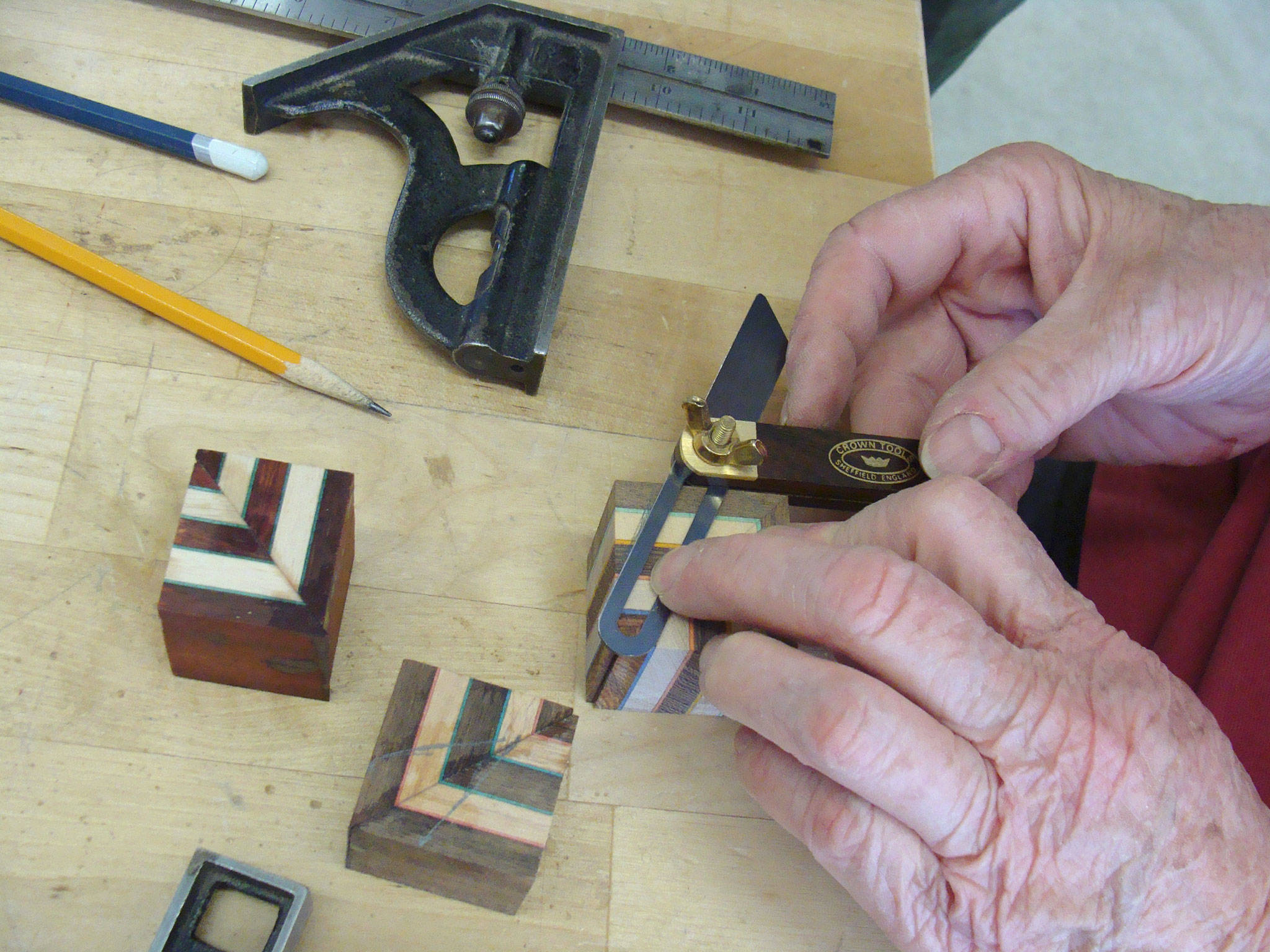 Collins said it takes her time to choose the right order for the woods before adding maple veneer and dry clamping it. Using jewelry epoxy, she laminates the block together and clamps it together. Once cured, Collins said she squares the block up for slicing at quarter-of-an-inch within 0.002 of an inch all four corners.