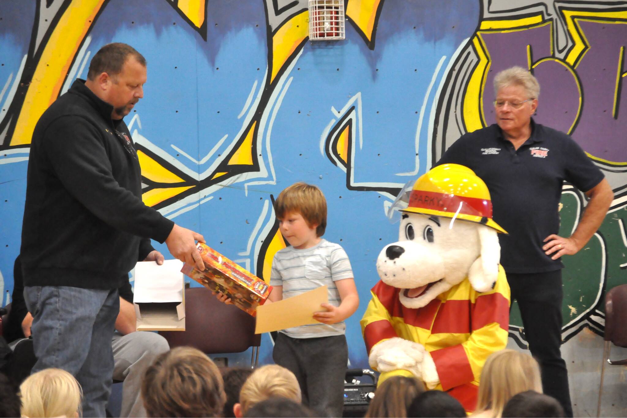 Battalion Chief Chris Turner and Sparky the Fire Dog, on behalf of Clallam County Fire District 3, presented Lucas with a firefighter action figure and a certificate naming him honorary assistant fire chief of prevention during Fire Prevention Week, Oct. 5-11.
