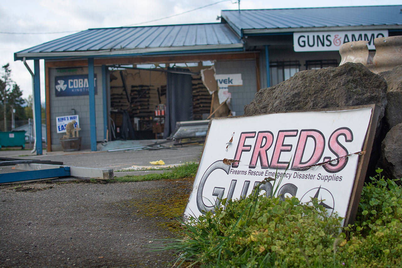 The federal Bureau of Alcohol, Tobacco, Firearms and Explosives is investigating after someone stole an agricultural loader, plowed it through the front of FREDS Guns in Sequim and stole upward of 20-30 handguns and ammunition.
