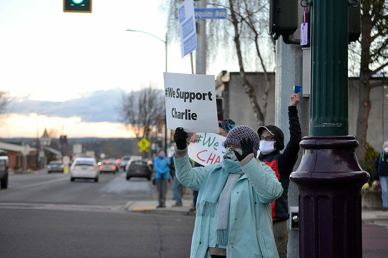 Janine Bocciardi of Sequim joins dozens of others as they wave signs at the Sequim Avenue/Washington Street intersection on Jan. 25 in support of Sequim city manager Charlie Bush. Sequim Gazette photo by Matthew Nash