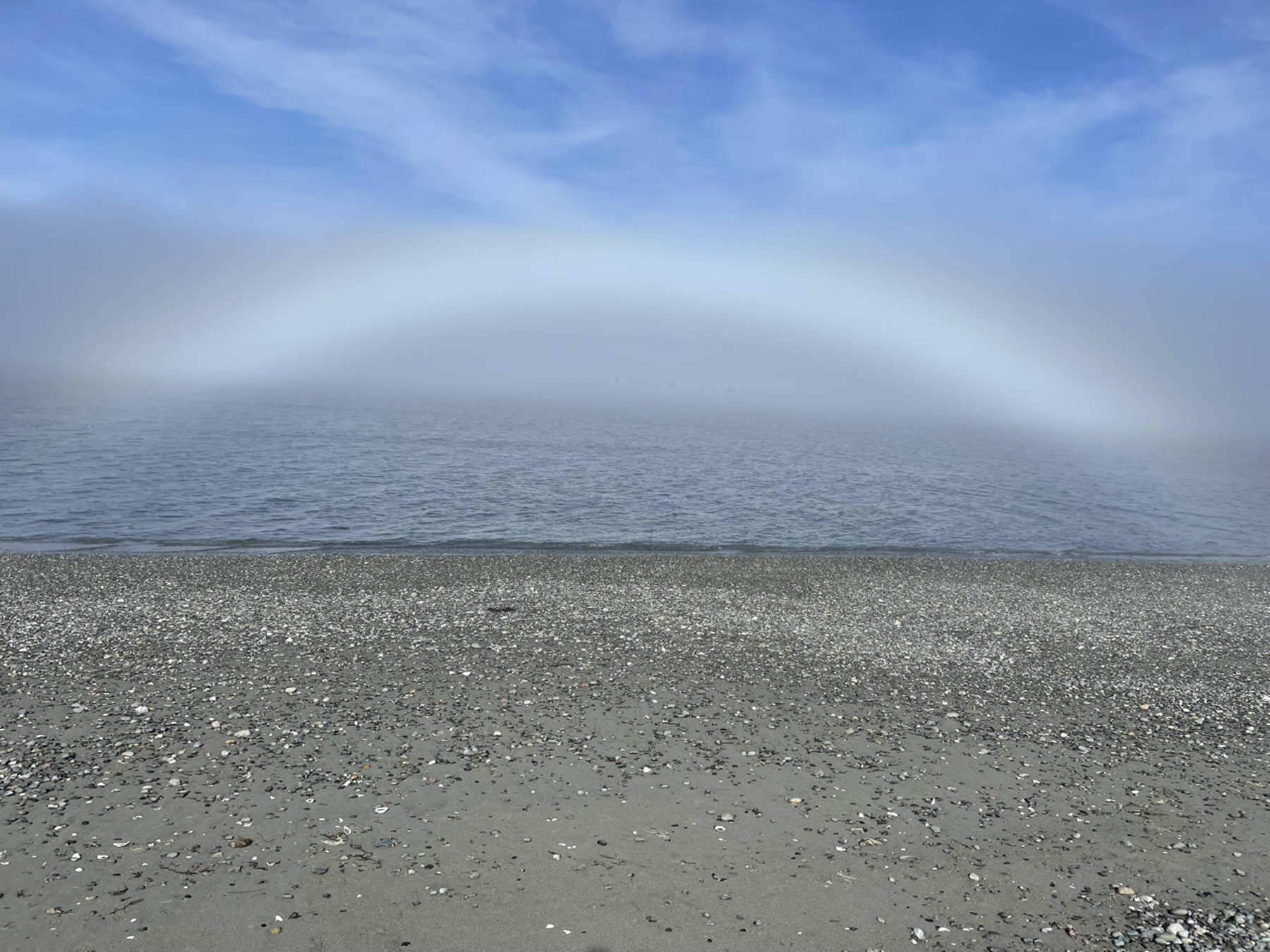Photo by Sandy Reed| Reader Sandy Reed submitted this photo of a “fog bow” that she snapped while walking along Graysmarsh Beach late Tuesday afternoon, March 25. A fog bow is different from a rainbow because fog droplets are much smaller than raindrops, which minimizes color and makes the bow appear white. Reed said that although it was sunny in Sequim, the Strait of Juan de Fuca was shrouded in thick fog. Suddenly, the sun broke through and formed a fog bow. “This one literally shimmered!” she wrote in an email to the Sequim Gazette.