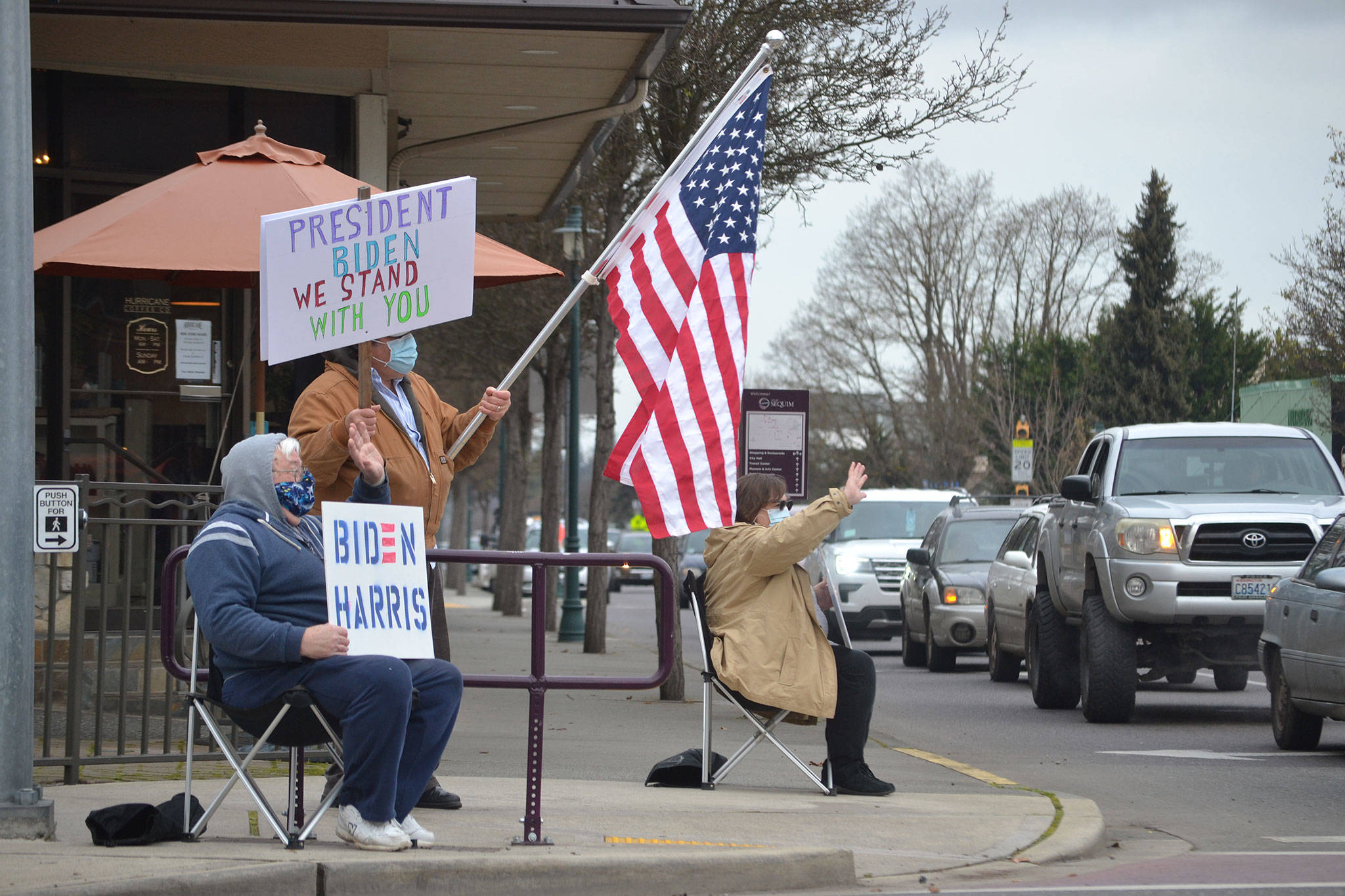 Hours after the inauguration of President Joseph Biden and Vice-President Kamala Harris on Jan. 20, a group of about 20 supporters spoke of phrases such as “hope” and “healing” at the corner of Washington Street and Sequim Avenue in downtown Sequim while waving American flags and holding signs.