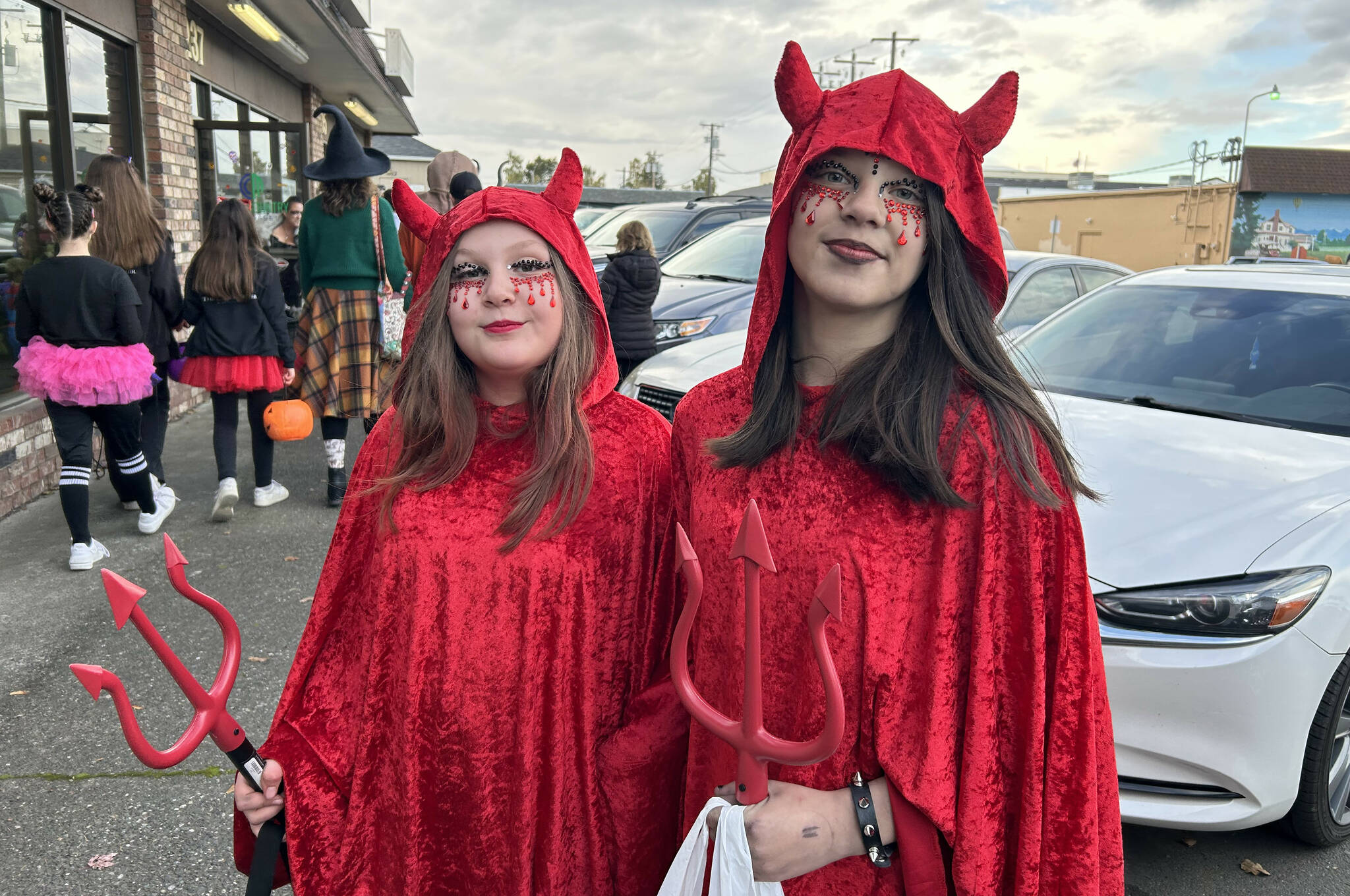 Leah Hitt and Harper Pickett, both 10, trick or treat on Halloween at Creamery Square businesses. Hitt said it was her idea for the costumes because “we both act like little devils sometimes.”