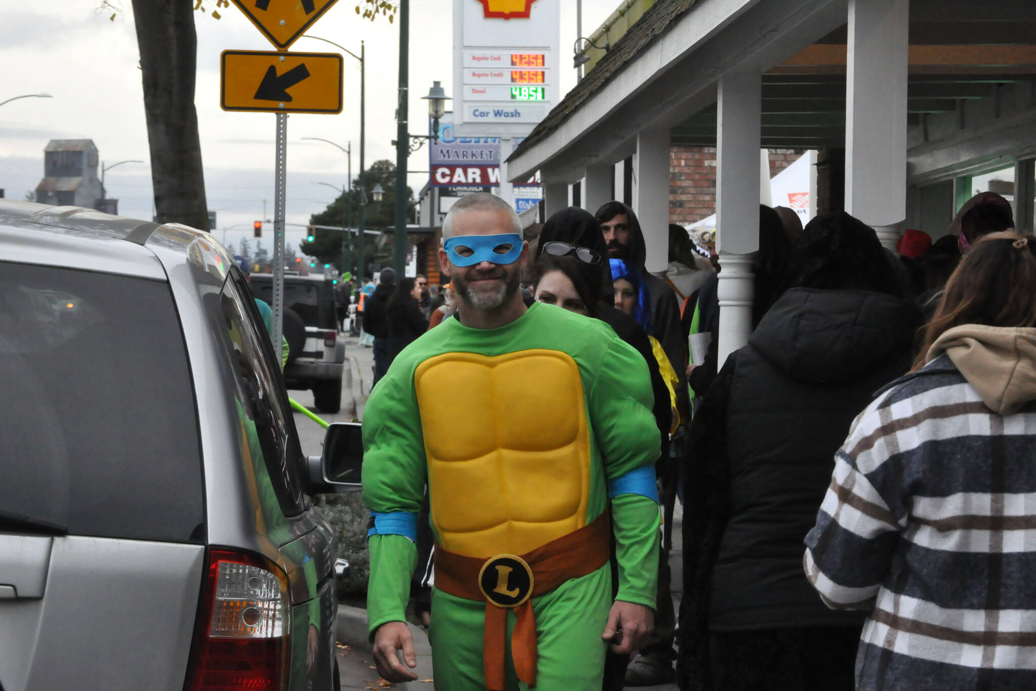 Kevin Pedrey walks in downtown Sequim on Halloween as Leonardo the Teenage Mutant Ninja Turtle. Pedrey said the character was a childhood favorite and he bought it eight years ago when his son was 1, and he wanted to wear it again.