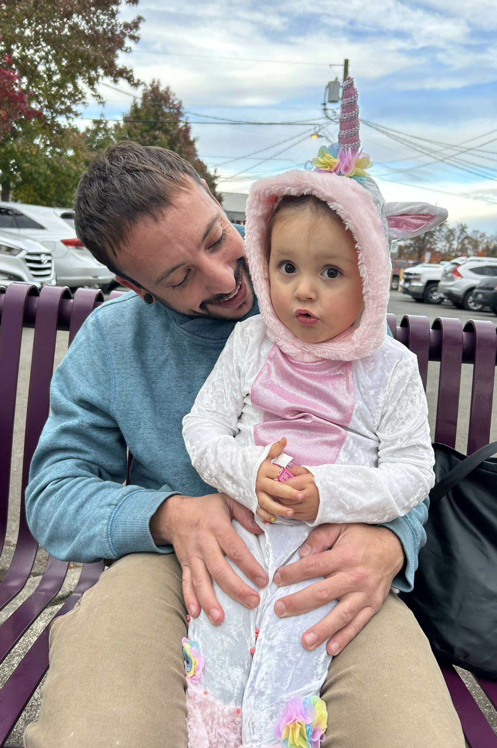 At right: John Gondek takes a break from trick-or-treating with his 3-year-old daughter Luna, dressed as a unicorn, who enjoys some candy on Halloween.