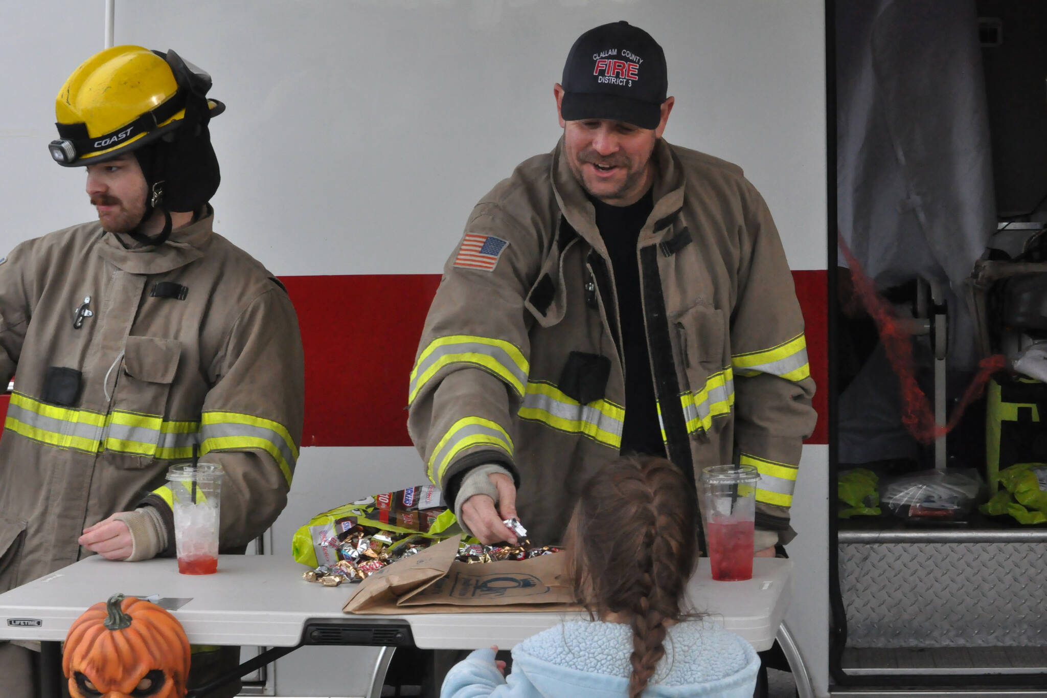 Sequim Gazette photo by Matthew Nash/ Volunteer firefighters Tommy Danielson and Andrew Rodgers with Clallam County Fire District 3 hand out candy on Halloween.