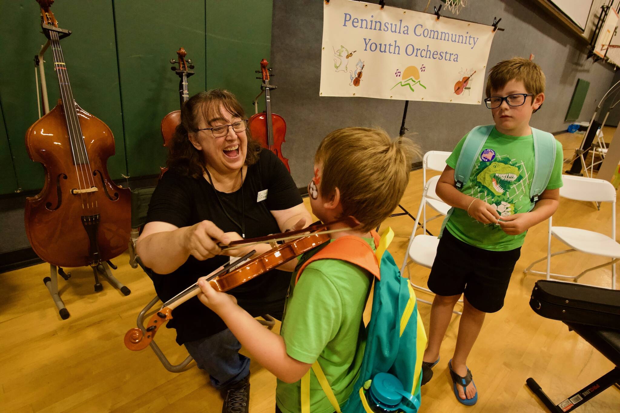 Carol Koenig (left) with Sequim Community Youth Orchestra shows Lucas Wright what it’s like to play a note on a violin as Caleb Wright (right) looks on.