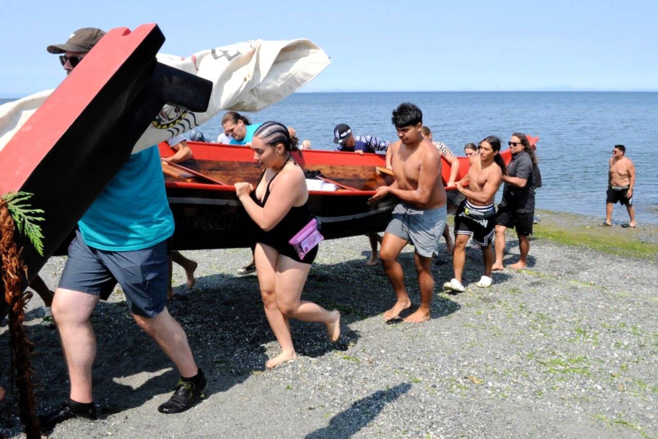 Sequim Gazette photo by Jacques Star/ Raylee Lewis of the Salish Spirit, second from left, helps bring their canoe in. She reports that it was smooth sailing until they got close to Jamestown Beach where the tribe had to deal with currents and lots of waves. She was in good spirits despite the challenges.